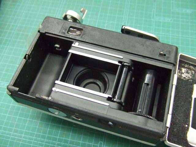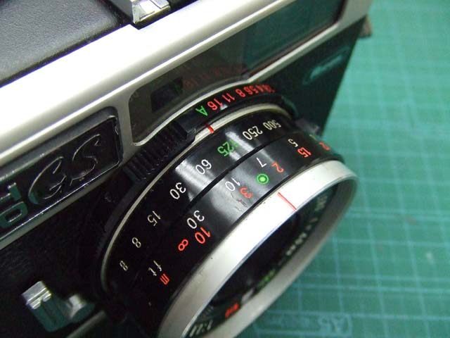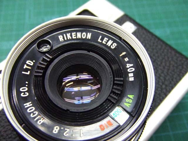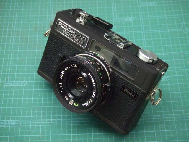 この当時の対抗機種といえば、コニカC35、ミノルタハイマチックEまたはF、ヤシカエレクトロ35GXといった所が有名ですね。 その中で明るいF1.7のレンズを付けたハイマチックEとエレクトロ35GXはちょっと大きめですが、F2.8のC35と、ハイマチックFはよりコンパクトでいま見ても楽しくさせてくれます。 今回のリコー500GSは、この小さい方に入ると思います。 しかしこれらのカメラは手軽さを目指したためでしょうが、露出は基本的にオートのみなのです。 それに比べて500GSは、シャッターも機械式。シャッター優先オートはありますが、マニュアルで露出を決めることが可能です。 そんな面白そうなカメラをジャン亀さんから頂いたというわけです。 ジャン亀さんによると、量販店のジャンク箱から救出したものとか。 でも見た感じはまあまあきれいですけどね。 ジャン亀さんありがとうございます。 では各部をよく見てみましょうか。 レンズはリケノン40mm,F2.8。 リケノンは私も持っているリコーマチック35で、写りの良さは既に知っています。 このカメラも写りの良さが期待できますね。 露出調整はシャッター優先オートと、マニュアルです。 シャッターも機械式ですので、シャッター優先の方が作りやすいのでしょうね。 ファインダーをのぞくと、左側にオート時の絞り値が指針表示されるようですね。 しかし、ファインダーはかなり汚れています。 ここは洗浄ですね。 裏蓋は巻き戻しノブを引っ張り上げて開けますが、その動きがどうも良くないです。 フィルム室は比較的きれいです。 しかし、モルトは朽ちています。 これは結構面積が広いですので、貼り替えるのがちょっと骨かもしれません。 電池室も液漏れもなくきれいです。 ですがこれに使うバッテリーH-Cは既に製造中止ですので、アダプターを使うかな? バッテリー無くても写るんですが、と思いながらもLR44をそのまま入れたらちゃんと動きました。 正確な値が出ているかどうかは分かりませんけどね。 ではでは、せっかくですのできれいに直して、そしてついでにちょっとモディファイしてみたいですね。 ブラックにするのは当たり前すぎて面白く無いですかね。 ただレンズ周りの文字のペイントが派手派手しいので、赤のペイントを白に変えると落ち着きますかね。 ちょっと考えてみましょう。