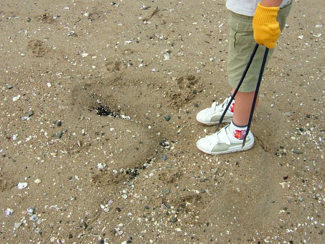 昨日までかなりの雨が降って警報が出るような天気でしたので、 なんだかヘドラの海のようにもなっています。 でも、海に浮いているものまで集めることもできませんので、清掃の対象は砂浜にしときましょう。 砂浜を見ているといろいろなものが目に入ってきます。 このくぼみは何でしょうか。 うちの子が言うには恐竜の足跡だそうです。 確かにそんな風に見えます。 こちらには、 シャコだかカニだかの巣穴があります。 海岸がきれいになってきたことが実感できます。 ところで、清掃の方はと言うと、 ちゃんとやってますよ。 流れ着いたごみも拾ったし、流木も拾いました。 作業前の状態と比較する画像がありませんが、きっと海岸もきれいになったことでしょう。 清掃イベントの時だけじゃなく、時々この浜にも遊びに来てもいいかも。