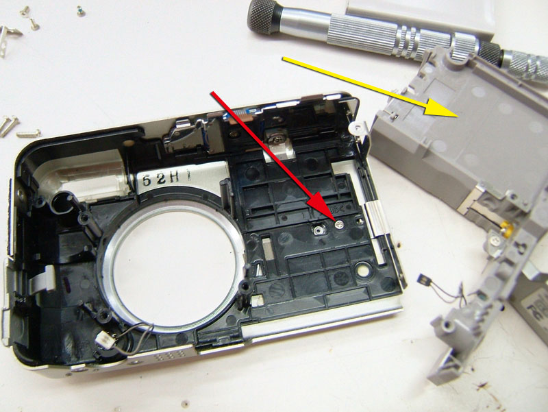 デジカメの前面に付いているものを外す時って、十中八九ほとんど分解しないといけないんですよね。これも多分そうなんでしょうね。しかも締結方法がネジならいいですが、焼き留や圧着だったら更にめんどくさい。しかもしかも、外した跡がフラットじゃなかったら…だからカッコ良くなる予想はできるものの、そんな面倒なことはやりたくない。 だって、バラそうと思うとまず外側カバーを外さないといけない。底面にある4本のプラスネジ。三脚穴に近い2本と残りの2本で長さが違うし。 側面のネジは特殊な頭。まぁ工具は有りますけどね。 それにせっかく貼った革を一部剥がさないといけないし。これらのネジを外したとしても前面カバーが外せるわけじゃないんですよ。 外れるのは背面カバーだけ。ここからもっとバラしていかないといけないから、さらに面倒になる。まずは黄矢印のフィルム基板をコネクターから外す。5箇所。それぞれロック方法が違うので確認しながら。それに、赤矢印の2本のプラスネジもはずさないといけない。しかもそれだけじゃなく、青矢印の黒いシールを剥がさないと次にススメない。 その黒いシールの下はこうなっていて、赤矢印の2箇所のプラスネジと、黄矢印の2箇所のコネクタを外さないといけない。ちなみになんで黒いシールが貼ってあるかというと、この辺りにフラッシュ用のコンデンサがあるので、触ると感電するから。たとえここまでの作業を行ったとしても、外せるのは背面の基板だけ。まだまだ例のグリップ部の締結箇所は見えてきません。 更に進めるには、レンズユニットも外さないといけない。赤矢印の3本のプラスネジ。レンズユニットが外れてもまだです。 黄矢印のバッテリーボックス部を取り外して、これでやっとグリップの締結部(赤矢印)が見えてくるというわけです。締結自体はプラスネジ1本なので簡単なんですけど、そこまでの行程が面倒でやる気が起こらない。そしてこのグリップを外すとどうなるか。 穴は色々あるものの、フラットですね。これなら革を貼れば大丈夫っぽい。昨日の要領でスキャン画像から型紙作って、貼り革を切り出せばいいだけなんで、それ自体はめんどくさいことじゃないんですけどね。 グリップ部が無い分、カットも簡単なんですけどね。これを貼ればきっとカッコよくなるはずなんですよ。 こんな感じに。 でもバラすのめんどくさい。