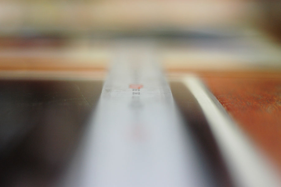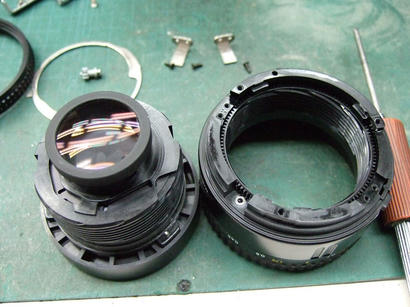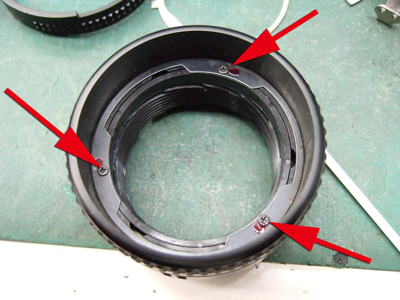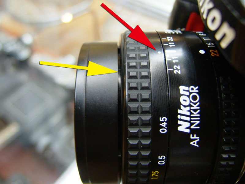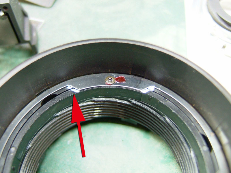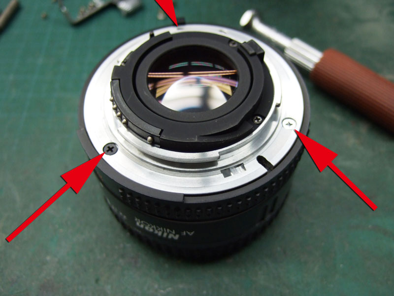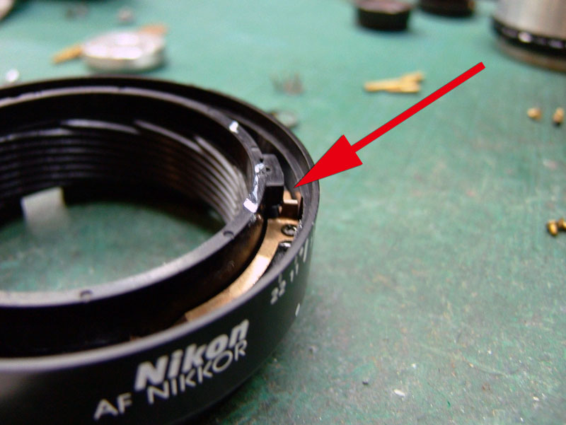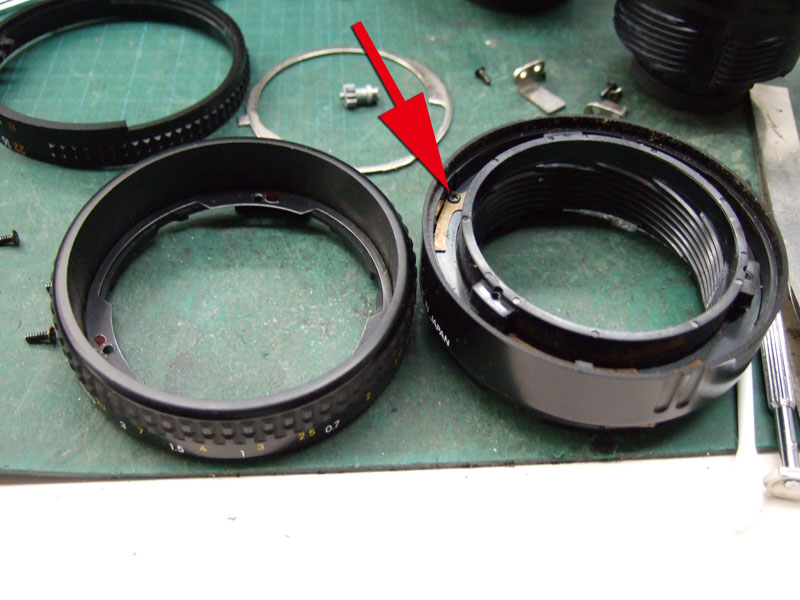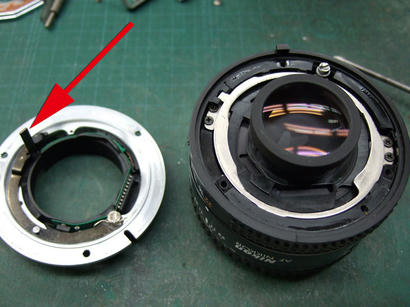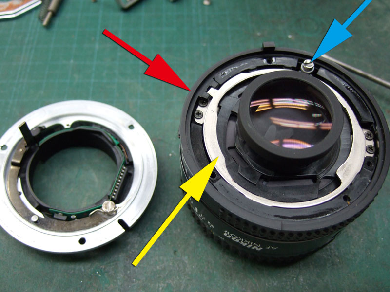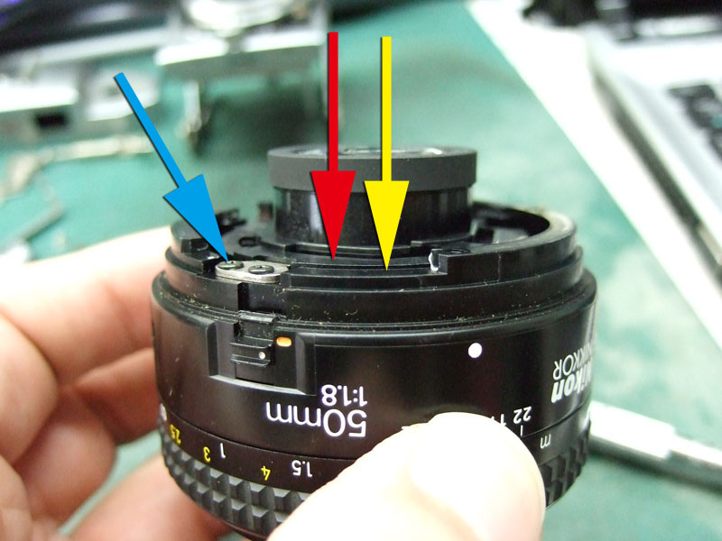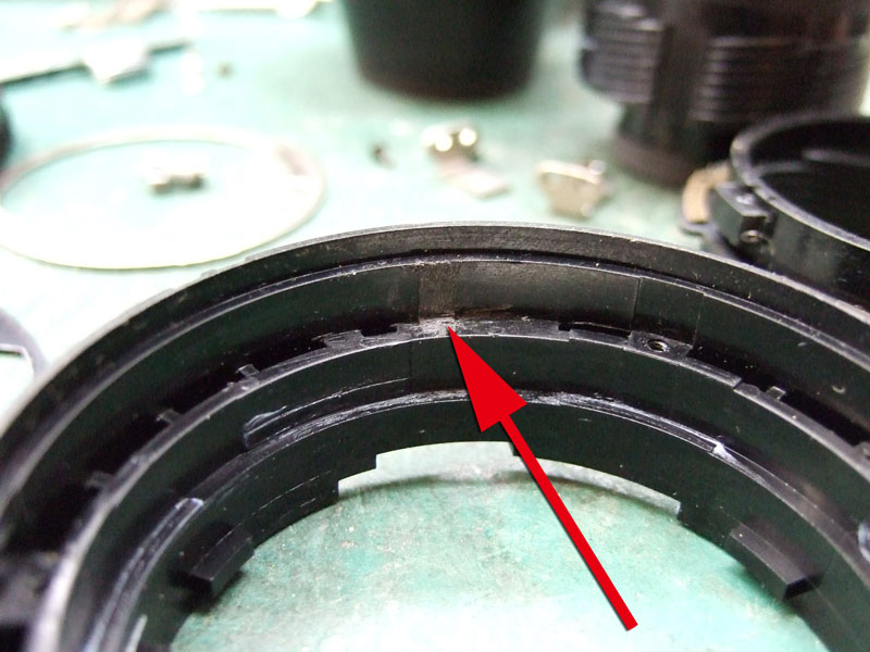 ではバラしにかかりますか。 まずはマウントを外します。矢印の三箇所のプラスネジを外しましょう。しかし何故か一箇所だけ黒いネジになってますね。 マウントが外れたら、矢印の3つの部品がポロポロと外せます。そしたら次は、ヘリコイドを分離するんですが、 無限遠にした時の位置を確認しときます。レンズ側の赤矢印の面と、鏡筒側の黄矢印の面がほぼツライチですね。組むときはこれを目安にします。では青矢印のプラスネジを外して、回り止め2箇所を取ります。 ということでヘリコイド分離。今回はレンズ側には手を加えません。鏡筒のピントリングの改造です。 では鏡筒のこちらから。矢印の三箇所のプラスネジを外すのですが、その前に、 こんなかんじで、マーキングしときましょうか。バラしてしまうとピントリングとヘリコイドの位置関係が変わりますので、同じ位置に組むための目安です。AFレンズですので、距離指標はあまり正確でなくてもいいかもしれませんが、やっぱりこのへんはきっちりしときたいところ。 ピントリングを外したら、矢印のネジ三箇所を外して、もういっちょ分離します。 そしたら鏡筒の内側の矢印の部分に注目。二箇所このような出っ張りがありますが、一箇所は無限遠側のストッパー。もう一箇所のこの矢印のところが、最短撮影距離側のストッパーです。ですのでこの出っ張りを、ニッパー等で躊躇なく切り落とします。 はい、こちら、切り落とし後。しかしこうなると、ストッパーがなくなってしまいますので、どこかにストッパーを設けないといけません。無くても一周すれば無限縁側で止まりはしますが、そこまで回せるほどヘリコイドに余裕がありません。それに加えて、問題はこちら。 この矢印の部分なのですが、これはマウント側の絞り連動ピンの動きをレンズ側の絞りに伝える部分です。で、ヘリコイドを繰り出しすぎると、このピンの長さの限界を超えて外れてしまうんですね。かと言ってこのピンを伸ばすと、ヘリコイドを縮めた時につっかえてしまって無限遠まで行かなくなるという、結構ギリギリの設計になってるんです。突き当たるところに穴掘れば伸ばせますが…ということで現状で届く範囲でとどめておきます。では、そのためのストッパーをどうするか。 ということでこの部品に活躍してもらいましょう。矢印の部分を折り曲げてみます。 はい、こんな感じに。3mmほど立ち上げればいいでしょうかね。そのへんはテーゲーで。ではこれを組み込んで、ちゃんと動くかどうか確認します。 が、ヘリコイドを回すと、ほんの少し干渉してしまいますね。なので、曲げた部分を当たらなくなるまで少し削りましょう。これでオッケー。ではレンズを組み直して、AFの動作と絞りの動作、オートで適正露出になるかも確認しましょうか。うん、ちゃんと動作してますよ。ただちょっと、 最短撮影距離まで回すと、黄矢印のように隙が出ますね。ま、いっか。ついでになんとなく指標のために、最短撮影距離のところにマーキングしておきましょう。このレンズの元々の最短撮影距離は45cm。そこからある程度は余分に回るようになりました。果たして最短撮影距離はどのくらいになったのでしょうか。 う、開放で撮ると被写界深度浅いですね。拡大してみましょう。 えーっと、概ね38cmですか。7cmほど余分に寄れるようになりましたね。できれば30cm以内にしたかったところですが、そこまでは対応できそうにありませんので、これで良しとしときましょう。微妙な結果になってしまいましたが、AF-NIKKOR 50mm F1.8の最短撮影距離を縮めることに一応成功ということで。