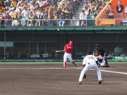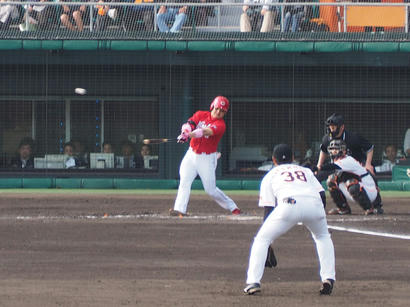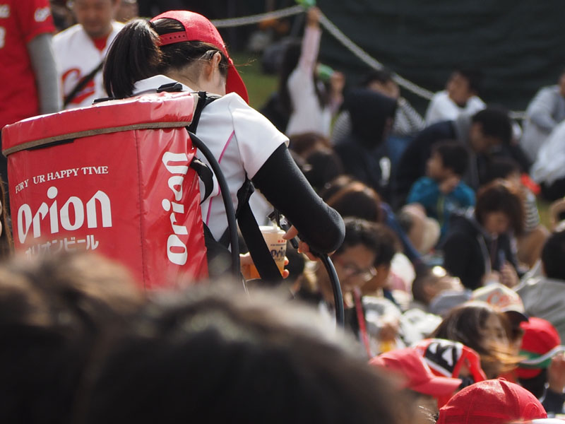 自分としては、沖縄セルラースタジアムというより、奥武山球場といった方がなじみがあるんですが、今の沖縄的にはどうなんでしょうか。試合開始時刻は13時。しかし飛行機の到着時刻が12:50。すぐに向かえばいいぐらいかなとは思っていたんですが、荷物も預けていたので出てくるのに時間もかかるし、ついでに空港のA&Wで昼飯買っていこうってことで、また時間がかかって、と言ってもそんなに慌てていかなくてもいいよねとか思いながら球場に向かいました。そしたら球場に入る直前にすごい歓声が聞こえてくる。ありゃ、もしかしていいとこ見逃したかな? 球場に入ってスコアボードを見てみると、あら、3回表が終わって既に3点入れてる。さっきの歓声はこれだったのね。ちょっと残念。今回とった席は外野自由席。のんびりハンバーガー食べながら見るのがいいかなと思ったのと、前売りだと安いんです。大人1200円。中学生以下500円。なんてリーズナブル。しかし当日券は、500円アップとか。となると、大人1700円と、中学生以下1000円ですか?子供の5割増しはどうなん?ま、前売り買っといてよかったけどね。ではエンダー食べながら応援しましょう。 が、しかし、4回以降はあんまり快音が聞こえませんね。そしてそれはジャイアンツも同じ。 ダブったり、ダブられたり。そうそう、ここでもおネェさんがビールを売って歩いていますが、 やっぱりそれはオリオンなのね。ZoomZoomばかり行ってると、こういうのも新鮮でおもしろい。 そして試合はまったり流れていきます。こういう雰囲気だと、いまいち応援にも身が入らないですよね…と、おお、堂林の犠牲フライで1点追加しましたよ。うん、この調子で押していこう。うーん、しかしやっぱりなんとなくまったりですか。大きく盛り上がることもなく9回へ。まぁ多分このままでも勝ってくれるんでしょう。すると、 やった、丸!2点タイムリー2ベース。おお、最後に大きく盛り上げてくれました。 6-0で、カープの勝利。丸、ありがとう。(*^_^*)