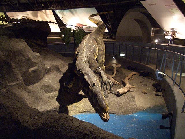 入り口近くにはオウムガイがいました。 オウムガイもカブトガニと同じく、古くからほとんど姿を変えずにいる、生きた化石と呼ばれる生物ですね。 属名はノーチラスと言うのだそうです。 最初の写真も新しい展示の一つで、メガロドンと言う古代の巨大鮫のあごの骨の展示です。 美ら海水族館にも同じようは展示がありますね。 でも見るたびに、本当にこんなのがいたのかなと思ってしまいます。 こちらは前からある展示で、カブトガニのエラを1匹分一枚一枚並べて展示したものです。 ちなみのここに写っているものは一部です。 すごい数があります。 海水から酸素を取り出す工夫と言うのはすごいもんだと感心します。 そしてこれが新しい展示。 恐竜関係の展示が以前より充実した感じがあります。 物によっては使いまわしの部分もありますが、展示の仕方が変更され、見やすくなっています。 カブトガニが生きてきたそれぞれの時代の生物を展示していると言うわけです。 それから、以前からある展示で、「バリオニクス」と言う恐竜の展示があるんですが、 この展示って、動くんですね。 今まで動いているのを見たことがなかったんですが、当分の間壊れたまま修理されなかったのでしょうか。 しかもその動きがリアルと言いますか、不必要なこだわりがあるといいますか。 よく見てみると、 まばたきします。 皆さんもぜひ行ってみて下さい。 それと、外には恐竜の原寸大の模型も置いてあるんですが、以前は触れたりもしたのですが、今では柵で囲まれてしまって、近付くことさえできなくなってしまいました。 ちなみにこちらの写真は、 2007年7月。 2009年1月の写真。 で、こちらが現在の写真です。 おまけでこちらも、 2009年1月と、 今の写真です。 よく見ると塗りなおして有りますね。 尻尾にぶら下がって折ってしまうようなやつがいたんでしょうか。