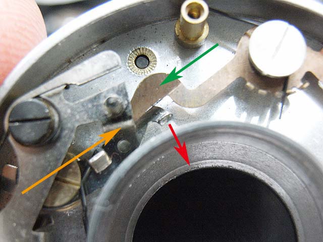 このカメラのシャッターは単純ですので、機構が分かりやすいと思います。 まずシャッターが押されると、赤矢印の部品が矢印の方向に動きます。 するとそれに押されて緑矢印のように次の部品が押され、スプリングでテンションが掛かっていた青矢印の部品も同様に動きます。 こんな感じでそれぞれ矢印の方に動いていきます。 この時、真鍮の部品の反対側はこのように動いていきます。 更に動いていくと、黄矢印の突起を超え、引っ掛かります。 これでシャッターセットが出来た状態になりました。 そしてシャッターボタンの動きを伝えている赤矢印のレバーは、真鍮色のレバーとの引っ掛かりの限界点をむかえます。 この時青矢印の部品の方は、すでに動作の限界をむかえていて、真鍮色のレバーからは離れた状態になっています。 引っ掛かりの限界を超えた真鍮色のレバーは、緑矢印のように戻ってきて一旦ここに引っ掛かります。 この時反対側では黄矢印のように連動したレバーを押し、シャッターが開きます。 でもまだ引っ掛かりは残っていて、シャッターを開け続けます。 緑矢印の真鍮色のレバーは青矢印の部品に引っ掛かっていましたが、戻る力で青矢印のようにレバーを動かします。 青矢印のレバーの反対側にはフライホイールがあって、青矢印の部品が戻る時間を遅らせます。 このことでシャッタースピードが調整されます。 シャッタースピードの調整は、シャッターセットされる祭に、青矢印の部品をどこまで動かしておくかで行います。 つまり、あまり動かさずに停めておけばフライホイールはあまり回されず、シャッタースピードは速くなりますし、沢山動かせておけば、戻る時にフライホイールを多く回すことになり、戻る時間が永くなってシャッタースピードは遅くなります。 そして最後には真鍮色のレバーは完全に戻り、黄矢印の部品との引っ掛かりが外れてこの部品も元に戻り、シャッターが閉じると言うわけです。 で、問題はこのシャッターが切れないと言うことです。 その不具合の原因はここから先にありました。 一旦上まであがった赤矢印のレバーは、シャッターボタンから指を離すと上の写真のように元のポジションまで戻ってきます。 この時緑矢印の部分の下をかすめるようにして戻っていきます。 どうやらここで引っ掛かって赤矢印の部品がちゃんと最後まで戻らず、次にシャッターボタンを押した時には緑矢印の部品に引っ掛からず、動かすことが出来ない状態になっていました。 模式図で説明します。 下の図は上の写真の橙矢印の方向から見たものと思ってください。 斜めの線が真鍮色の部品の引っ掛かる部分。 垂直に立ったのが一連の写真の赤矢印の部品の引っ掛かり部分です。 「1」で、シャッターが押されると右へ移動していき、「2」で斜めの部品の端に当たり、そのまま押し続けて引っ掛かりの限界点をむかえます。 限界を超えると、斜めの部品は「3」のようにもとに戻り、シャッターボタンから指を離すことで、垂直の部品は右方向に戻っていきます。そして「4」のように斜めの部品に当たりますが、それを押し上げて元の位置まで戻るはずです。 が、「4」の状態で止まってしまって最後まで戻っていないのが不具合の原因です。 なので、赤矢印の部品を下に押し下げるように少しだけ曲げて、真鍮色の部品との接触部分にほんの少しグリスをつけました。 と言うことでこれで動くようになりました。 修理自体は簡単なものでしたので後は組みなおします。 残りの不具合はモルトの劣化と、ヘリコイドの硬さですね。 だがしかし、露出設定をオートにした室内の暗い環境の時も、マニュアル絞りの開放の時も、なんか完全に開放になっていませんね。 何かちょっと絞りの動作関係のあたりの動きが悪いようです。 これは新たな不具合発見です。 では改めて修理に挑みますか。