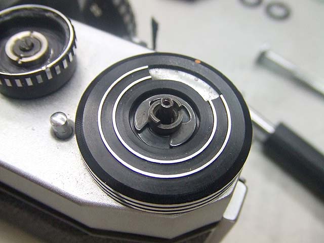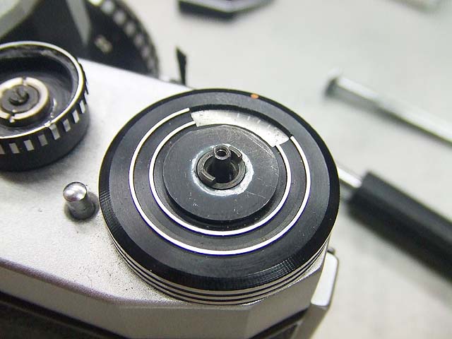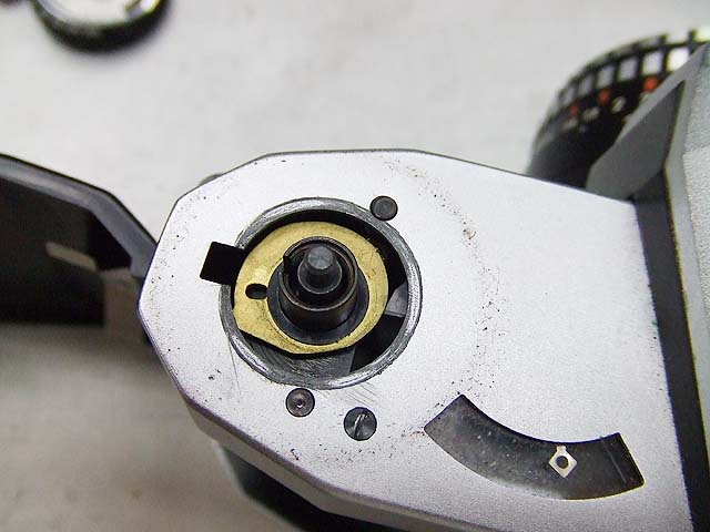 多分誰もが好きじゃないかと思いますが、ネジ部の上にメクラ蓋をしているタイプです。 これをはがすのが簡単ではありません。 しかもこのカメラ、それが2箇所も有るんですよ。 メクラ蓋をはがすには、まずテープを試します。 粘着力の強いテープを貼って、勢いよくはがします。 運がいいとメクラ蓋もはがれます。 それがダメなら隙間にカッターの刃や極細のドライバーなどを差し込んでこじ開けます。 しかし今回のはその隙間もほとんど無く、しかも接着が結構強いんです。 仕方がないので、ドライバーの先がしっかり食い込むように、蓋の端っこを少し掘っていきます。 それでできた穴に細いドライバーを突っ込んで、やっとメクラ蓋が外れました。 では次に巻上げ部を外していきましょう。 まずは真ん中のマイナスネジを外します。 そしたら次に、 カニ目ネジを外して、フィルム種表示ダイヤルを取ります。 こちらが外したネジたちです。 巻き上げレバーを外すとワッシャー状のスペーサーが2枚入っていました。 それを外すと、下からEリングが出てきました。 これを外せばカウンターのカバーが外れるはず。 が、 このEリング、落ち込んだ中にありますよね。 Eリングは横にスライドさせて外すものですが、と言うことは、外すためのスペースが無いと言うことですか? じゃぁ、Eリングは外せない? ??? よく分からないのでここはおいといて、次行きましょう。 シャッタースピードダイヤルを外しました。 赤矢印で示したところにマイナスネジがありますが。ここは外さなくていいです。 巻き上げレバーを外すと、小さいワッシャーが一枚ありますので、それを取って、その下のカニ目ネジを緩めます。 そしたら露出計追針用のダイヤルがごっそり外れます。 その下から出てきた黒いマイナスネジは、ここでは外しません。 まだ巻上げ部にあるカウンターのカバーが外れていませんが、軍艦部カバーの締結ネジを外すと何か進展があるかも知れません。 軍艦部の前後側面にある4本のマイナスネジを外しましょう。 すると、 軍艦部が外れてくれました。 しかもプリズムや、露出計は軍艦部に締結された状態です。 ピントに携わる部分が分離される構造になっているなんて、 大丈夫なの?と思ってしまいます。 問題だったカウンター部のカバーですが、 これもご覧のように軍艦部カバーに付けられていました。 セレンとメーターも軍艦部に付いたまま外れますので、セレンからの配線を外したりする必要がない点では良い設計だと思います。 カメラ側はこんな感じです。 カバーの外れたカウンターダイヤルが見えます。 その隣には巻上げとシャッターセット関係のギアが見えますね。 軍艦部を外しただけでフォーカシングスクリーンにいきなりアクセスできると言うのは、ある意味便利です。 スクリーンの左の大穴は、露出計のメーターの逃がしですが、大袈裟な感じがします。 と言ったところで続きはまた今度。 露出計は直るのか。