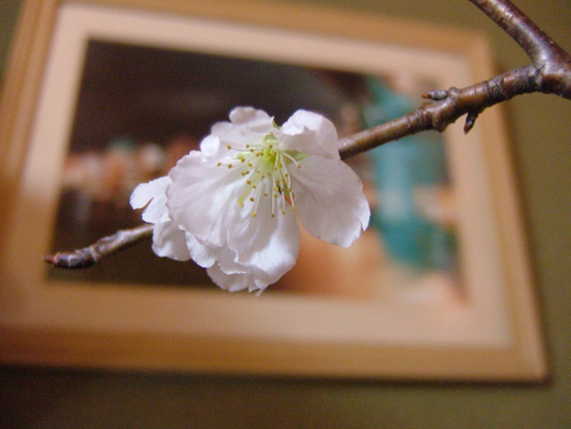 1週間前くらいに、うちの子供の宿題で「発見日記」って言うのがあったんですが、そのネタとして庭の桜の花の芽を観察したんです。芽を外から見るだけじゃなくてカミソリで切って中を観察したりしようってことで、小さい枝を切ってきたんですが、観察が終わって枝を捨てるのももったいないなと思って、ダメ元で水切りして部屋に置いてたんですね。