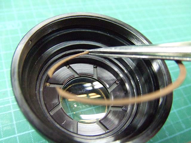 では、絞り羽根を押さえている部品を留めているリングを外します。