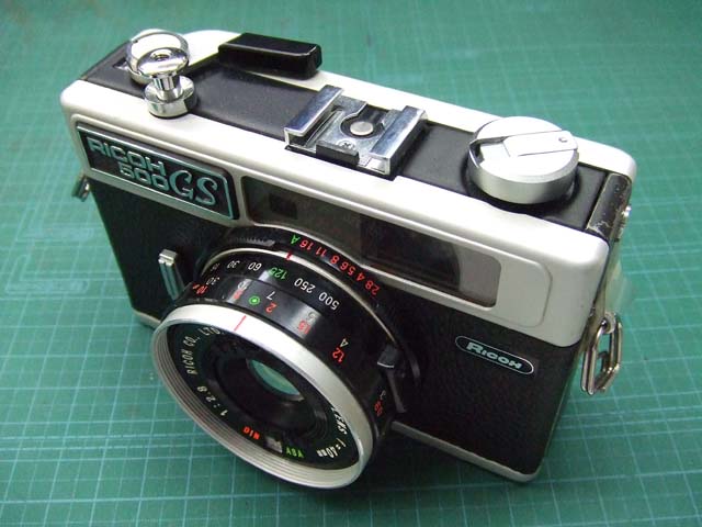 この当時の対抗機種といえば、コニカC35、ミノルタハイマチックEまたはF、ヤシカエレクトロ35GXといった所が有名ですね。 その中で明るいF1.7のレンズを付けたハイマチックEとエレクトロ35GXはちょっと大きめですが、F2.8のC35と、ハイマチックFはよりコンパクトでいま見ても楽しくさせてくれます。 今回のリコー500GSは、この小さい方に入ると思います。 しかしこれらのカメラは手軽さを目指したためでしょうが、露出は基本的にオートのみなのです。 それに比べて500GSは、シャッターも機械式。シャッター優先オートはありますが、マニュアルで露出を決めることが可能です。 そんな面白そうなカメラをジャン亀さんから頂いたというわけです。 ジャン亀さんによると、量販店のジャンク箱から救出したものとか。 でも見た感じはまあまあきれいですけどね。 ジャン亀さんありがとうございます。 では各部をよく見てみましょうか。 レンズはリケノン40mm,F2.8。 リケノンは私も持っているリコーマチック35で、写りの良さは既に知っています。 このカメラも写りの良さが期待できますね。 露出調整はシャッター優先オートと、マニュアルです。 シャッターも機械式ですので、シャッター優先の方が作りやすいのでしょうね。 ファインダーをのぞくと、左側にオート時の絞り値が指針表示されるようですね。 しかし、ファインダーはかなり汚れています。 ここは洗浄ですね。 裏蓋は巻き戻しノブを引っ張り上げて開けますが、その動きがどうも良くないです。 フィルム室は比較的きれいです。 しかし、モルトは朽ちています。 これは結構面積が広いですので、貼り替えるのがちょっと骨かもしれません。 電池室も液漏れもなくきれいです。 ですがこれに使うバッテリーH-Cは既に製造中止ですので、アダプターを使うかな? バッテリー無くても写るんですが、と思いながらもLR44をそのまま入れたらちゃんと動きました。 正確な値が出ているかどうかは分かりませんけどね。 ではでは、せっかくですのできれいに直して、そしてついでにちょっとモディファイしてみたいですね。 ブラックにするのは当たり前すぎて面白く無いですかね。 ただレンズ周りの文字のペイントが派手派手しいので、赤のペイントを白に変えると落ち着きますかね。 ちょっと考えてみましょう。