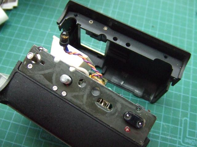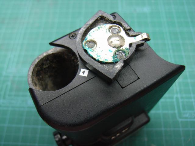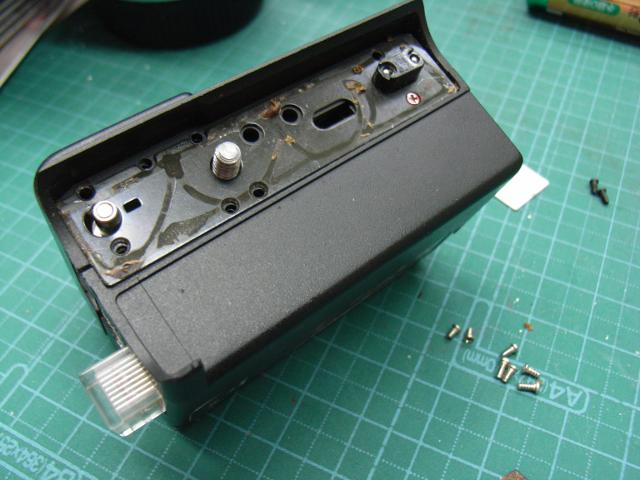 私としてはXAにこのフラッシュをつけてしまうと大きくなってしまいますので、使おうとは思っていませんが、せっかく買ったものを動かないままほっとくのももったいない話です。 ではまずは外観を見てみましょうか。 まず目についたのは、反射板の上の方のメッキが剥がれていること。 これはとりあえず、シルバーのペイントマーカーででも塗っときましょう。 そして電池室の方を見てみると、 液漏れで緑青がついてますね。 中にも液漏れの様子がありますので、この辺がチャージしない原因のようですね。 ではバラしましょう。 ここは剥がさなくても良かったんでしょうが、取ってみると可変抵抗のようなのが見えますね。 センサーの調整用でしょうか。 ではカメラとの接続部分にあるゴムを剥がします。 そしたらその下から出てくるネジを外します。 ここでは全部外してしまいましたが、一番上と一番下の表側のネジを1本ずつ外せばいいのかもしれません。 ネジは長さや種類がいろいろありますので、外した時に、どれがどこに入るのか、分かるようにしておくことをお勧めします。 という事でケースを開けました。 ネジ留め部分の反対側は爪で引っ掛けて有りますので、爪を折らないように注意してください。 ケースを開けて電池の接点を見てみますと、接点の金具とリード線のハンダ付け部分が錆びたようになってしまっていて、触るとすぐに千切れてしまいました。 仕方がありません。ハンダ付けをし直します。 しかし、この金具にはハンダが全然乗りません。 ですので、一旦接点をキレイにしたあと、ヤスリで削ってハンダの乗りを良くします。 そして接点金具にしっかり熱を加えて、まずは金具の方にハンダを乗せておきます。 そしたらリード線の方にもハンダを乗せて、それを合わせて付けます。 とりあえずこれで直ったと思います。 では組んで行きましょうか。 スイッチ部分はこうなっています。 カバーを開けたときにスイッチ部分がバラけてしまったので、元々どうなっていたか分からないんですが、多分こうでしょうね。 それとおまけ、 ケースを開けた基板はこんな感じです。 ではケースをはめ直して、電池を入れて、カメラにセットしてスイッチを入れると、 プッィィィィーーーン チャージ音が鳴りりました。 しばらく待つとチャージ完了。 シャッターを切ってみると、ちゃんと発光しました。 OK,以上、修理終わり。