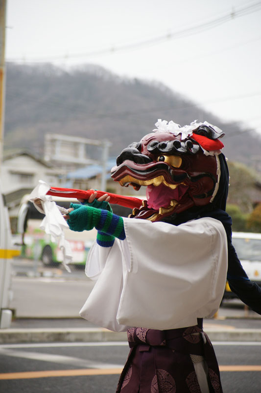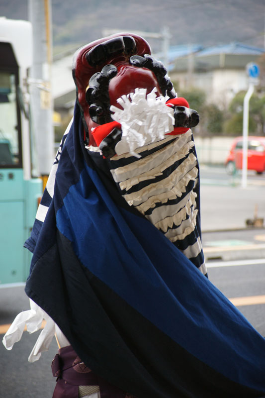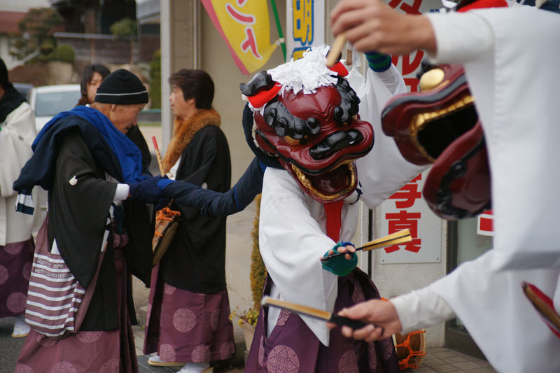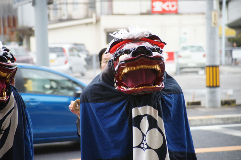 獅子は2体で舞ってくれます。 ポニーテール状態でひとしきり舞った後、 今度は後ろの布を広げて、より激しい動きになっていきます。 最後は2体並んでフィニッシュ。 商売繁盛、家内安全をご祈念して頂きました。 ついでに今年は頭も噛んでもらいましたので、私もきっと頭が良くなることでしょう。 じゃなくて無病息災? ありがとうございました。 来年もよろしくお願い致します。