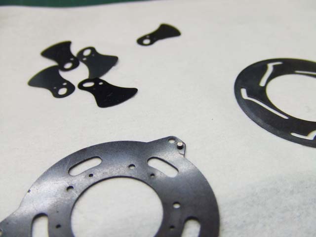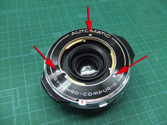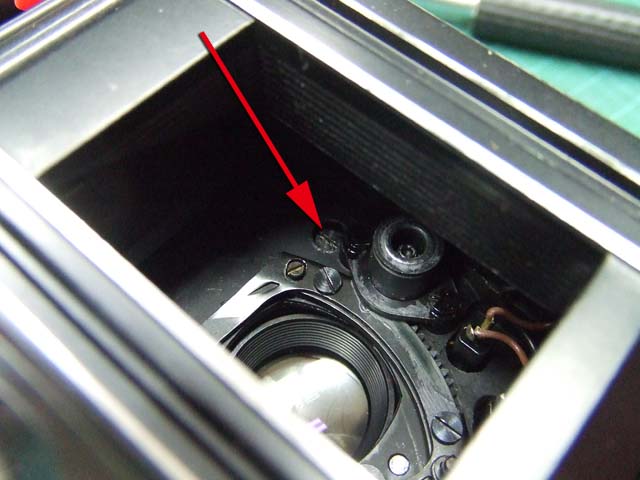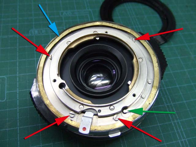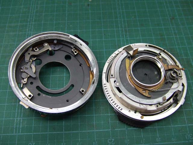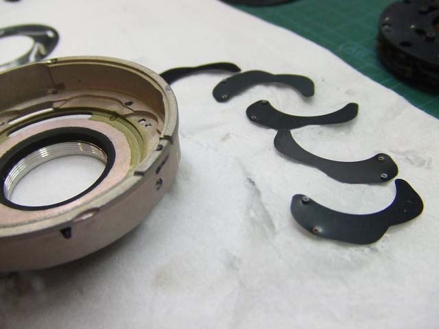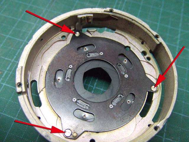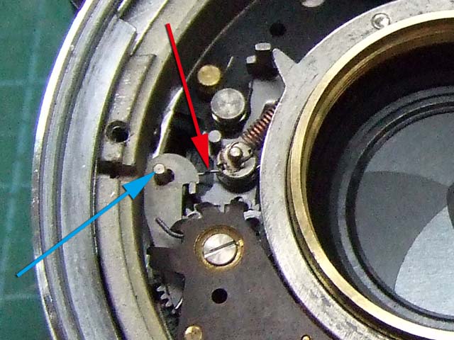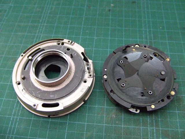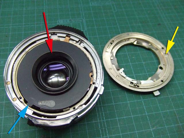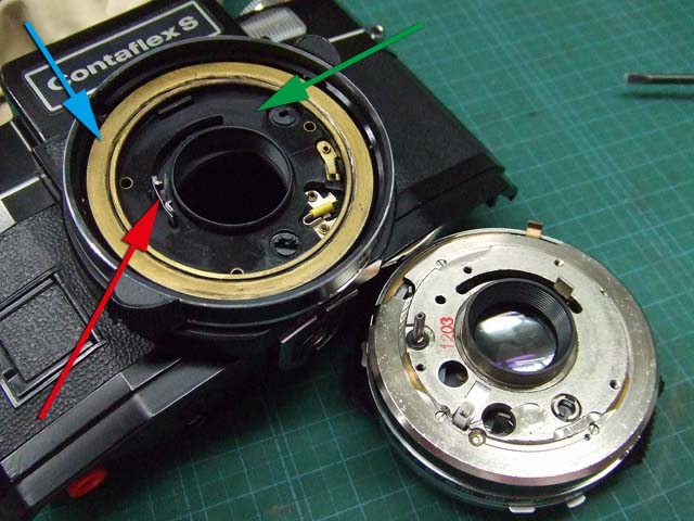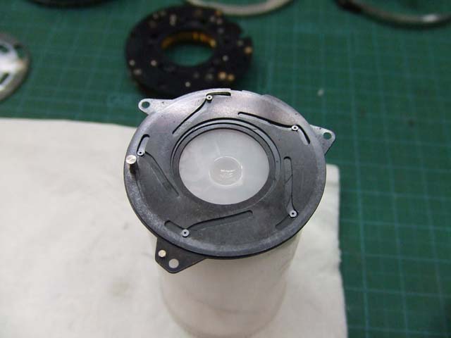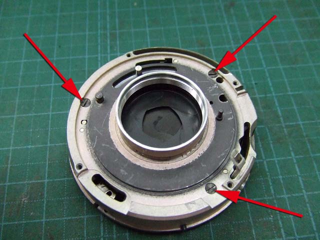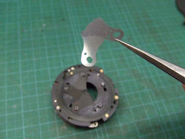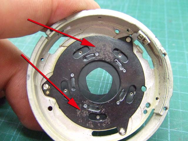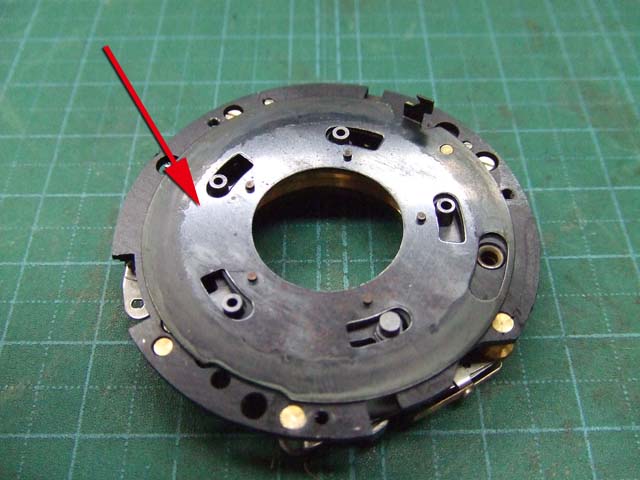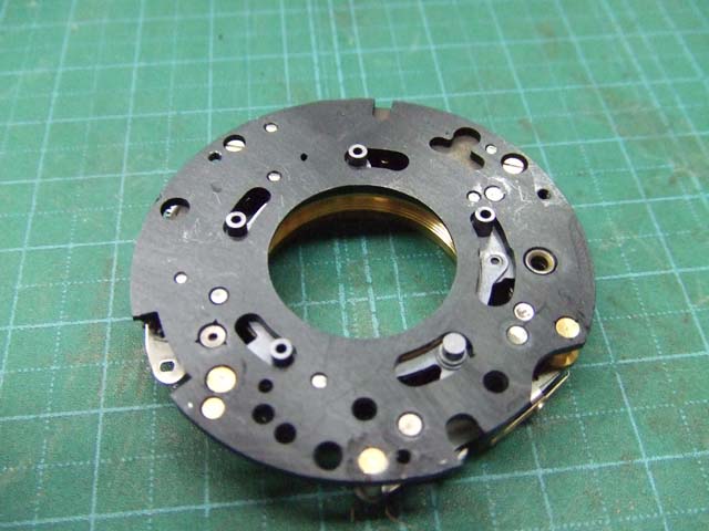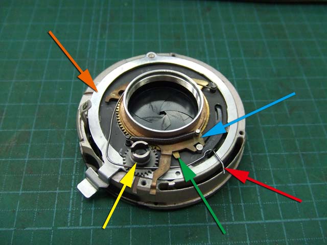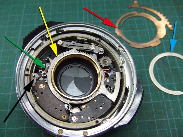 そのために、フィルム室からレンズの方をのぞいて、矢印のマイナスネジを外します。 これと同じようなマイナスネジが合計3本有りますので、それらをすべて外します。 そしたらこのように、 簡単に外せます。 で、レンズを外した後に、赤矢印のレバーがここまでいっぱいに回ってしまうと動かせなくなってしまいます。 そこは気をつけといた方がいいのですが、何かのはずみで回ってしまうこともしばしばです。 しかし、これを直すには緑矢印の黒い樹脂のプレートを起こしてやらないといけません。 そしてその黒いプレートを起こすには、青矢印のヘリコイドを外さなくてはいけません。 そうなると当然ピント調整をしないといけなくなります。 今回はこのようにレバーがいっぱい回ってしまいましたし、元々ピント調整もするつもりでしたので、ヘリコイドを外して黒いプレートを起こします。 が、それは後ほど。 まずはレンズをバラしましょう。 化粧プレートの矢印のマイナスネジを外します。 次に青矢印のワッシャー?スペーサー? を取って、赤矢印の4本のマイナスネジを外します。 するとマウントを外すことができます。 この時、緑矢印の所にシャッタースピードダイヤルのクリック用のベアリングがありますので落とさないように気を付けましょう。 これでマウントが外れました。 今度組む時に、黒いプレートの青矢印の突起部が、マウント裏の黄矢印のくぼみにハマるようになります。 そしたら赤矢印のレンズ中群を外して、その下の黒いプレートも外します。 黒いプレートを外しましたら、青矢印のリングを外して、 赤矢印と、黄矢印のリングを外していきます。 黄矢印のリングは、緑矢印の所にスプリングが掛けてありますので、組む時には注意して下さい。 なお、黒矢印のところも重要です。 拡大して見てみましょう。 赤矢印のスプリングが分かりますでしょうか。 このスプリングは青矢印の棒の向こう側に引っ掛けてあります。 これからレンズをバラしていくと、青矢印の棒を抜く必要があります。 その時当然赤矢印のスプリングは外れてしまいますので、組む時に掛ける必要があります。 これを掛けていないと、セルフタイマーがうまく働かなくなりますので、そんな場合はここを疑ってみて下さい。 では裏返して、レンズユニットのハウジングを外します。 矢印の4本のマイナスネジを外します。 するとこのようにハウジングは外れます。 では出てきたシャッターユニットをバラします。 まずは赤矢印のスプリングを外して、 青矢印の部品を外します。 この部品は、ストッパーリングで留めてありますので、まずそれを外してから。 そしたらその下の緑矢印の部品を外します。 緑矢印の部品は、黄矢印の部品とのギアの掛かる位置を確認しておいて下さい。 次に黄矢印の部品を外します。 これは裏側からシャフトが貫通していて、一見取れなさそうですが、軽く圧入してあるだけですので、 根本をドライバーなどでゆっくりコジってやれば外せます。 それが外れたら、オレンジ矢印のリングが外せます。 このリングがセルフタイマー設定用のリングです。 このリングに付いた棒状の突起にスプリングが掛かります。 裏側の部品が全部外れたら、矢印のマイナスネジ3本を外して、シャッターユニットのハウジングを外します。 はい、外れました。 ハウジング側には絞りが残っています。 ではシャッター羽根を外して洗浄しましょう。 もちあげると、 やっぱり油が回って粘っていました。 シャッター羽根を外したらこんな状態になります。 矢印のプレートが回ってシャッターを動かします。 このプレートも外して洗浄しましょう。 プレートも外すとこんな感じ。 この表面も脱脂します。 では絞り羽根もついでにバラします。 シャッターユニットのハウジングを裏返して、矢印の3本のマイナスネジを外します。 その前に、 よく見ると、指紋の形にプレートが錆びていました。 前にバラしたような感じは無いので、もしかすると製造段階でついた指紋かもしれません。 しかしここに塗装するわけにも、グリスなどを塗っておくわけにもいきませんので、 としあえず錆を落とすだけにとどめましょうか。 バラした絞り羽根と、 シャッター羽根、そして、絞り制御用のプレート2枚も含めて、シベてベンジンで洗浄します。 これでやっと折り返しです。 では組んで行きましょうか。 組むのは逆の手順でやるのですが、絞り羽根を組むのは難しいです。 そういう時は、こんなふうにフィルムのPケースに載せて組んで、そのままハウジングを被せるようにすれば組みやすいです。 と言うことで、シャッターの分解清掃、完了です。