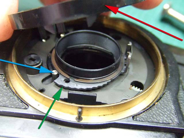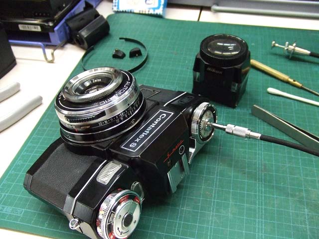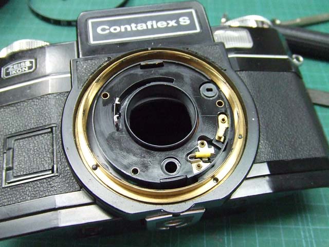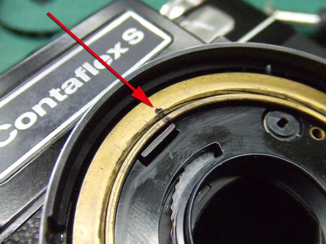6日の記事で少し書きましたが、コンタフレックスSのレンズを外した時、シャッタースピードの連携レバーが左にいっぱい回ってしまうと動かなくなるということへの対応をしましょう。