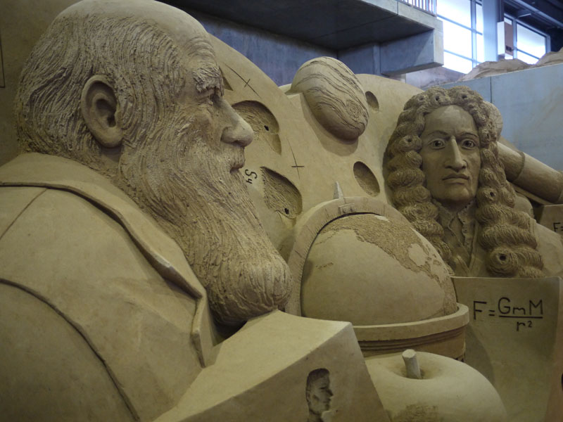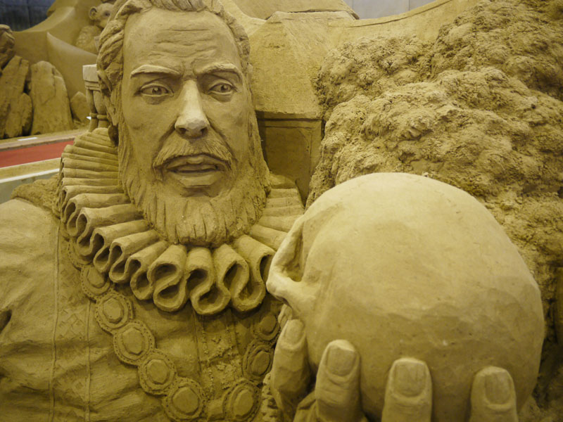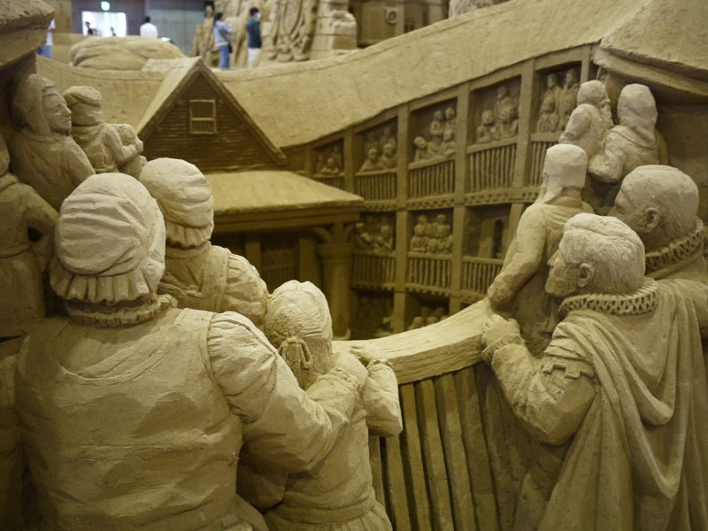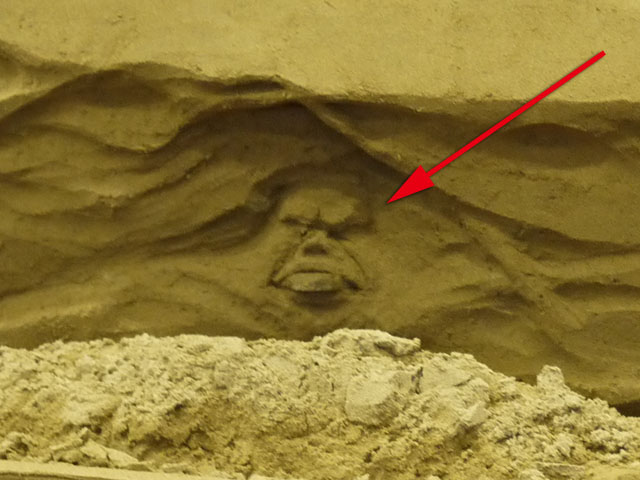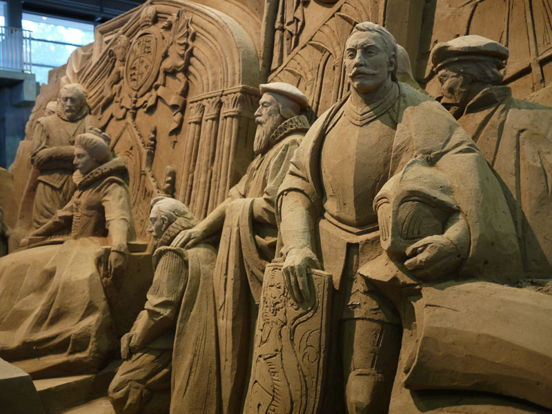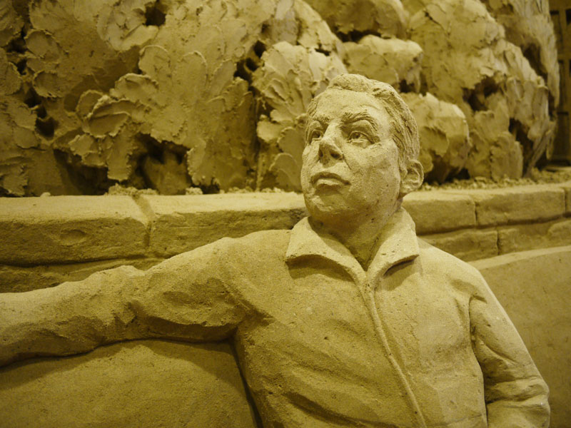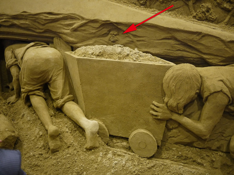 砂の美術館として砂像の展示が始まったのは2006年かららしいのですが、実は先月、屋内展示室がオープンしたらしいのです。 つまりできたばっかり。 そして今回の展示テーマは「イギリス」なんだそうです。 では展示してある砂像を見てみましょう。 これらは全て砂で作ってるんですよね。 見ていて面白いです。 でね、ちょっと気付いたんですが、 どうも所々に隠れキャラがあるようなんですよ。 これは砂像の一部分の森なんですが、 矢印の部分、ドクロがあります。 拡大して見てみましょう。 ほら、このとおり。 他にも、 これは炭鉱の様子ですが、こちらの矢印部分。 炭鉱を掘った壁面に顔が浮かび上がっていますよね。 他にも探せば有るのかもしれませんが、そのつもりで見ていませんでしたので、気付いたのはこの2つ。 これを探すのも面白いですね。 会場の上の階にはぐると通路があり、展示場を見渡せるようになっています。 砂像はどうやら離れて見ることを想定して作っているようで、近くで見るとなにか歪んだように見えるんです。 ですので、この位置からの方がいい感じだと思います。 ここの展示、なかなかお勧めですよ。