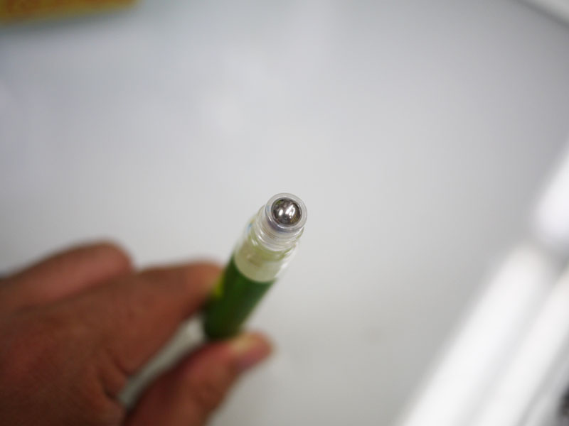 キャップを開くと、このように先端がボール状になっていて、転がしてつけるようになっています。