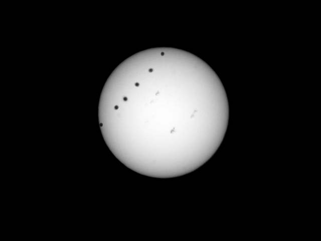 テレビなどの報道では、先日の金環食の時に使った日食グラスを使って、今回の金星通過を見ようということを言ってましたが、私は当初から疑問を持っていました。 本当に見えるのかと。 と言うのも、金星なんて、夜空に明るく輝いているから肉眼で確認できるわけで、双眼鏡で見たとしても光る点にしか見えません。 そんな小さいものが肉眼で確認できるのか。 もちろん見えればいいなと思っていたんですが、実際に日食グラスで見てみると、やっぱり予想通り。 私の目の分解能では点は確認できませんでした。 おそらく多くの人がそうであったのではないかと思います。 目の分解能の優れた方もおられるでしょうから、そういう方は見れたかもしれないのですが… ま、それは置いといて、 今回の撮影には月食の時に用意したセットをそのまま使いました。 月食の時に予行演習をしようと思っていたんですが、その時は曇りで撮影しませんでしたので、今回はぶっつけ本番です。 あ、もちろんフィルターは付けてますよ。 フィルターについては先日の金環食の時と同じ手法です。 カメラはパナソニックLUMIX GF3。 レンズはミノルタ200m F4にX2テレコンバーターで400mm。 それをマウントアダプタを使ってマイクロフォーサーズにつけますので、実質800mm。 更にデジタルズームを使って1600mm相当の画角で撮影です。 では撮影に入りましょう。 7時10分頃から重なり始めて、終わるのが午後1時50分頃とか。 そんな長時間カメラを置きっぱなしには出来ませんので、その都度設置しましょう。 と言いますか、太陽は意外と早く動きますからね。 赤道儀がない状態では置きっぱなしにしておいても意味はありません。 そして午前7時10分を過ぎた頃、金星が見え始めました。 この写真は7時22分の状態です。 金星はゆっくり時間をかけて太陽面を通過しますので、一瞬の出来事というわけではないのは撮影では助かります。 しかし先日の金環食とは違って、晴天に恵まれましたので撮影には条件はいいものの、雲の風情もなく、グラフィカルな映像しか撮れないのはちょっと残念。 なので時間を追って撮影したものを1枚に重ねてみました。 ちゃんと時刻を決めて撮ったわけではありませんので、間隔はまちまちですが、 金星が太陽を通過していった感じがわかると思います。 太陽の黒点を基準にして位置合わせしようとしたのですが、太陽も自転しているということを忘れていました。 重ねてみると黒点もちょっとずつ動いていますね。 仕方がないので、まぁこんな感じかなという具合で重ねました。 それと、途中で面白いものが写ったんですよ。 それがこちら。 この1枚だけ、とっても大きい黒点のようなものが写っています。 もしかして太陽表面の大爆発の瞬間を撮ったのかと思ったのですが。 多分違うんでしょう。 もしそうなら8分後に何かしらの影響が地球にあったはずですが、そんな感じもないし。 で、よく見ると うーん。 こりゃ多分、 鳥ですね。 たまたま「鳥の太陽面通過」を撮影したんでしょう。 金星と合わせて面白い写真になりました。 といった感じの金星の太陽面通過でした。 次回の105年後も撮影にチャレンジしよう。