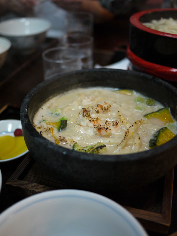 白いスープはクリーミーで、野菜やうどんにベストマッチ、そして一緒に入っているエビのむき身が良いアクセントになっています。