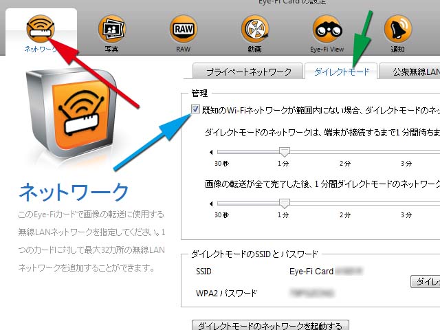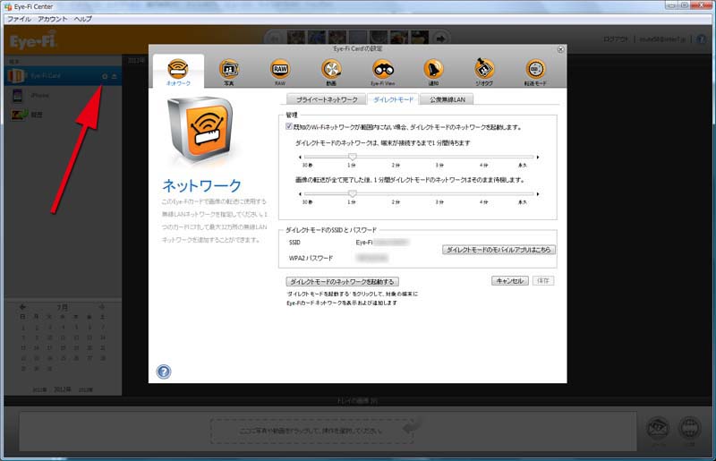 そのEye-Fiカードなんですが、無線LANでのイントラネット接続だけでなく、無線LANが無い環境でもスマートフォンなどと直接接続する機能もあるようなんですね。