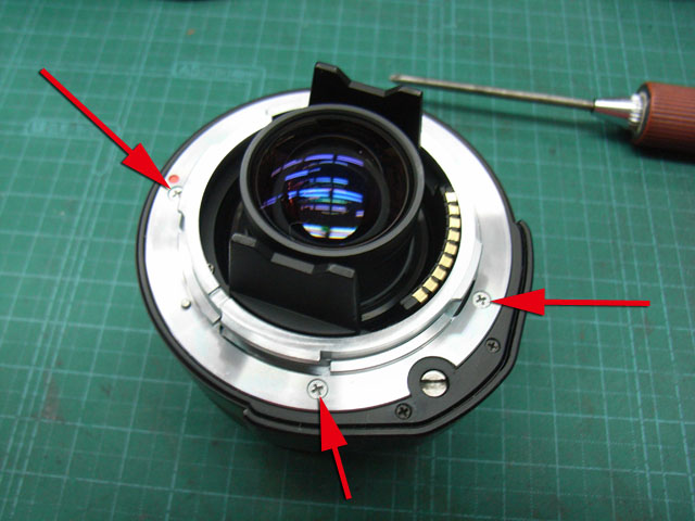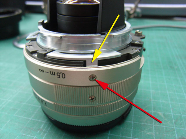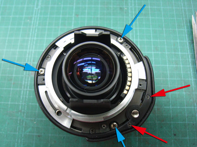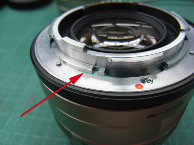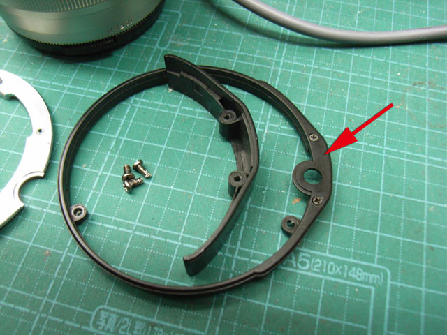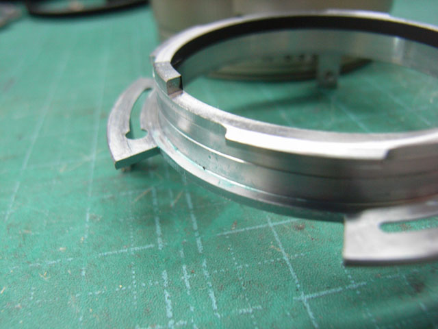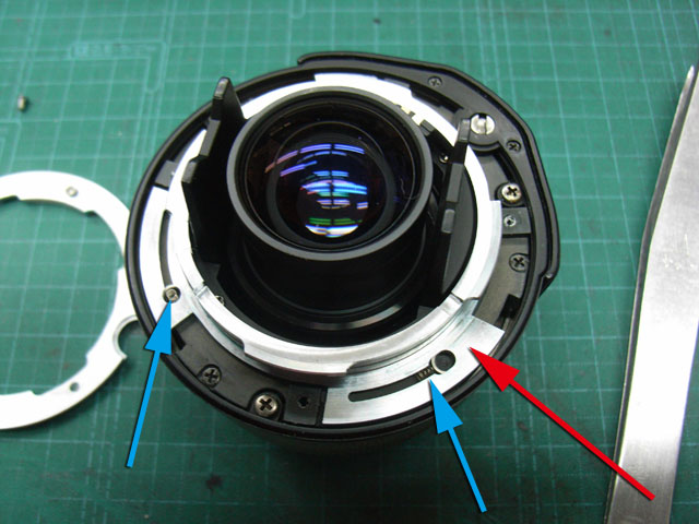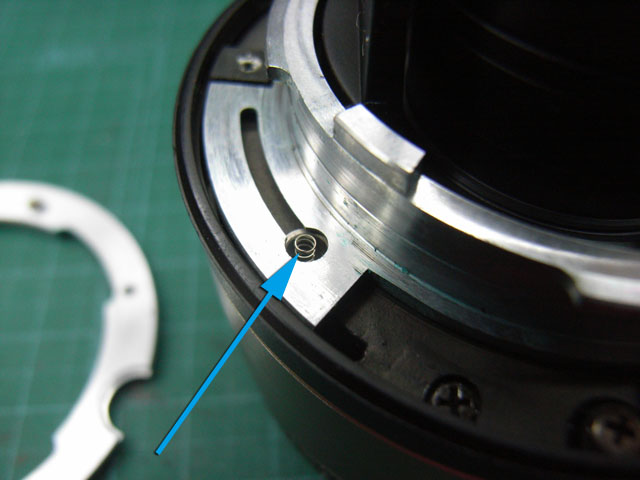 まぁ、これは多くの人は分かっているでしょうが、緑青です。 つまり錆。 海に持って行ったりすると、どうしてもこのへんには緑青が出やすくなりますね。 と言うことでマウントの分解清掃です。 一般的なレンズであれば、何も分解しなくてもマウント周辺の清掃は行えますが、コンタックスGシリーズのレンズマウントは、チョット複雑で、ちゃんと掃除するためには分解しないといけません。 ではまずマウント外側を外します。 矢印のプラスネジですが見えているのが3本、向こう側にももう1本ありますので、これを外します。 外すとこうなっています。 赤矢印がバヨネットです。 一般的なレンズではバヨネットはレンズに固定されていて、レンズを回して着脱しますが、 このレンズの場合は、レンズ自体は回さずに、バヨネット部のみ回転させて着脱する仕組みになっています。 そして青矢印のスプリングは、レンズの位置決めピンを押すスプリングです。 拡大すると分かりやすいですが、こういうふうに凹みに入っています。 しかし組む時は、先ほど外したカバーにある位置決めピンにつけた形で組んだほうがいいでしょう。 もう一箇所のスプリングは凹みから外れていますね。 無くさないようにスプリングを取っておきます。 そしたら次に、黒いプラスチックのカバーを外します。 赤矢印の2つのプラスネジを外すだけでよかったんですが、青矢印のプラスネジ3本も外してしまいました。 こちらが外したプラスチックカバー。 つまり矢印のリング状の方は外さなくていいわけです。 カバーが外れたら、鏡胴側面にある赤矢印の3本のプラスネジを外します。 バヨネットからは黄矢印のように足が出ていて、プラスネジで固定されているわけです。 そして外れたバヨネットがこちら。 これでやっとエイリアンのよだれを綺麗にできそうです。 清掃が済んだら元に組み直しますが、 ここで問題発生。 プラスチックカバーのネジ部が、経年劣化のために割れています。 そのせいでネジがキチリ締まらず馬鹿になってますね。 しかたがないのでプラリペアで修正しましょうか。 割れたところは取り除いて、新たに樹脂を盛りつけて再生します。 これでOKでしょう。 というわけで、Gレンズのマウント部の清掃終了です。