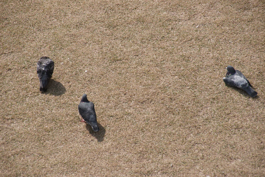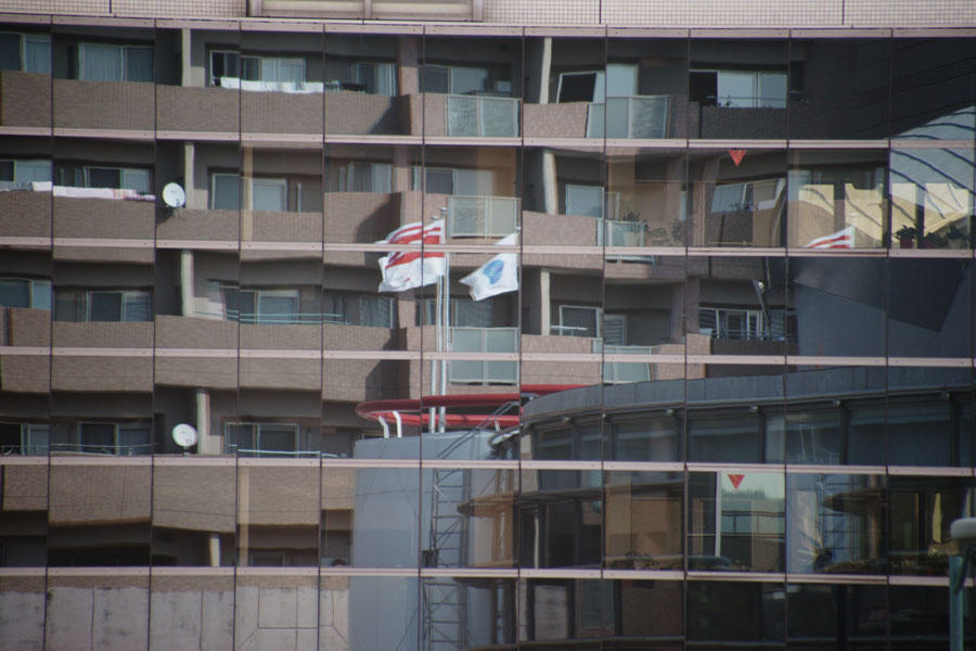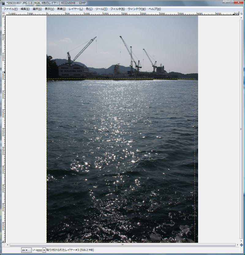 なんか目で見たよりキラキラしてないんですよね。 これはどういうわけでしょうか。 私が思うに、多分残像だろうと思うんです。 動く波に従って、キラキラ光を反射しているのが、連続して起きてますよね。 人の目には強く光ったものが、ある程度の間残像として目に残っていて、いっぱいキラキラして見えるんじゃないでしょうか。 しかしカメラで撮影すると、シャッタースピードは遅くても1/125秒。 多くの場合は1/250秒から1/1000秒くらいでしょう。 そんな瞬間を捉えてますので、やはり光っている点は少ないのでしょうね。 かと言って、シャッタースピードを遅くして撮ると、光が流れたようになったり、波がブレたりして面白く無いです。 と言うことで、連射したコマを重ねてみたらどうだろうかと思ってやってみました。 船の上から撮りましたので、連写でも背景が動いてしまいます。 ですので海の部分のみ切り出して3コマ重ねてみましょう。 私がよく使う画像処理ソフトは、フォトショップなんですが、遊びの画像処理にお金を掛けたくないという方にはGIMPがお勧め。 ウエブサイトは英語ですが、ソフトは日本語に対応しています。 ではGIMPを使って、3枚の画像を重ねて、適当に位置を合わせます。 そしたら上のレイヤの海の部分だけ切り抜いて、 それぞれのレイヤのモードを、「比較(明)」にしましょう。 そうすることで明るい部分が重なって見えてきます。 で、出来上がったのがこちら。 最初の写真に比べると、キラキラの粒が増えて、見た感じに近くなりました。 こんな感じで、ちょっとした画像処理でも、写真が楽しくなりますね。 他にも尾道駅周辺を撮影しましたので、ちょっとだけ載せておきましょう。 芝生で鳩が休んでいました。 これも画像処理で、暗めに仕上げました。 グリーンヒルホテルに写った向かいのマンション。 これは重ねなくても結構キラキラが写りました。 この日はテアトロシェルネでのイベントの撮影があったんですが、その帰りに片手間に撮ってみました。 その辺をちょっと歩くときでも、カメラを持って気軽にちょこちょこ写すと、意外に面白い写真が撮れるんじゃないでしょうか。