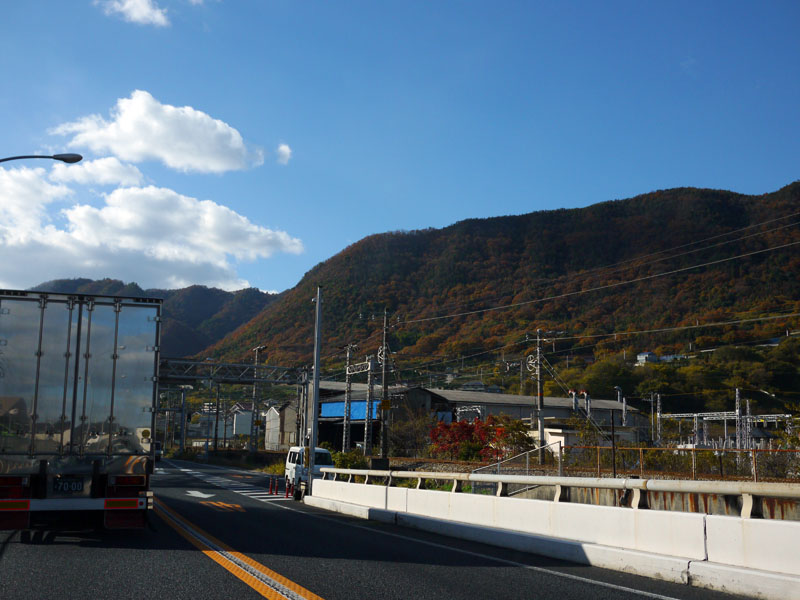 道路に沿って連なる山は、紅葉真っ盛りといった感じですね。