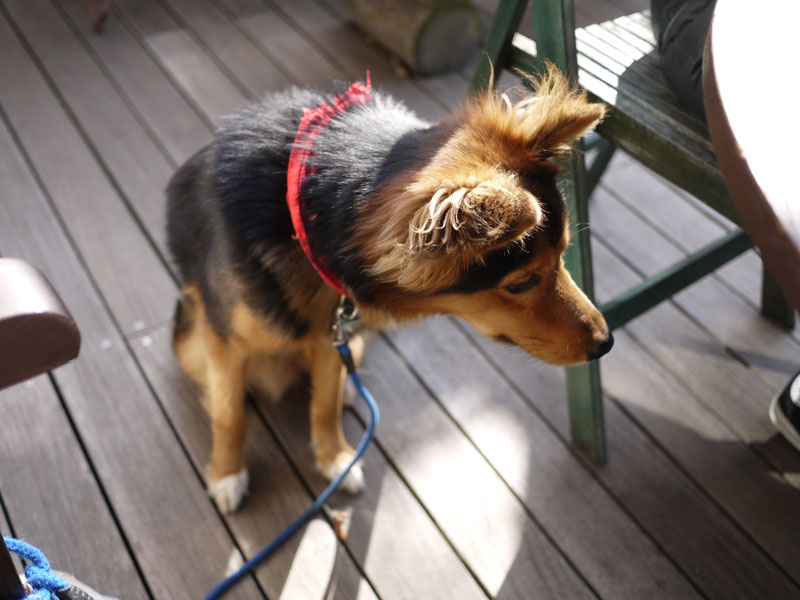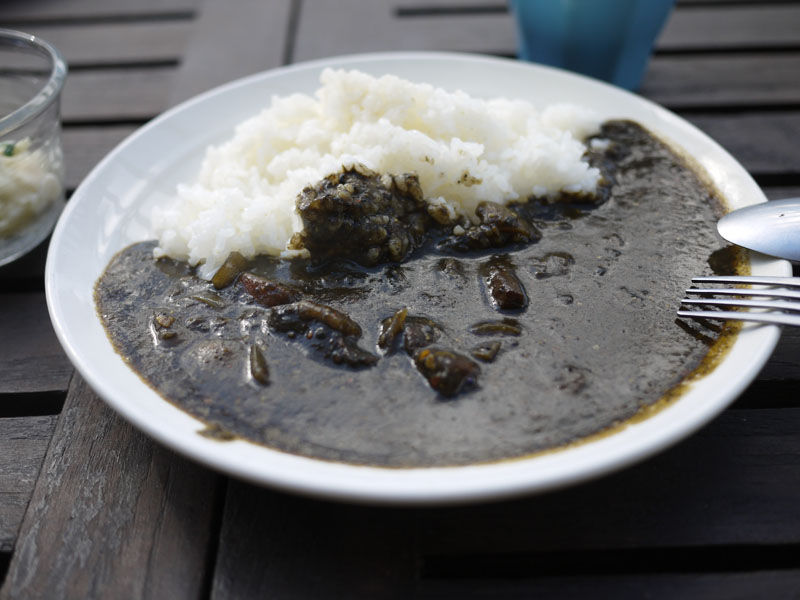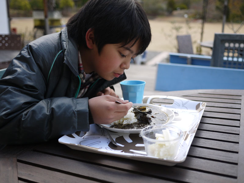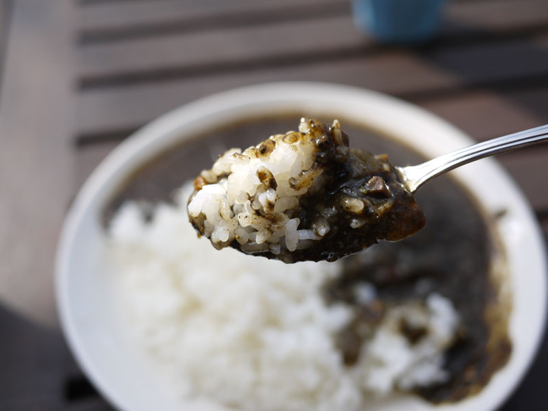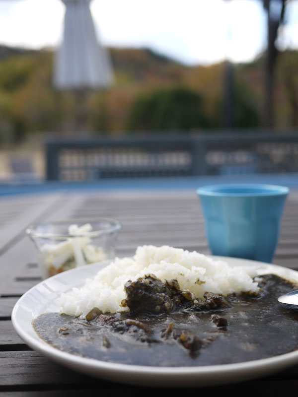 メニューには「黒カレー」と書いてあります。 肉はどうやらイノシシ肉のようですね。 ではうちの子と合わせて二人前をお願いしましょう。 しかし外で食べるにはちょっと寒すぎますか。 展示棟で食べることもできるんですが、今回はケン君を連れてきていますので震えながら外で食べることにしましょう。 ではいただきます。 おおー、スパイシーで美味しいですね。 中に何か小さな粒があってこおばしい感じです。 味は辛さの中にも上品な甘さを感じますね。 マスターに聞いてみると、この粒は胡麻なんだそうです。 それで少し甘みがあったんですね。 そしてそのゴマのためにルーが黒いんだそうです。 なるほど。 ボクも寒いと言いながらカレーを食べてます。 でも早く食べないと、カレーが冷えてしまいますね。 ケン君は何か落ちてこないか床を凝視しています。 寒い思いをしながら食べるカレーも、なかなかいけますよ。 あ、珈琲頼めばよかった。