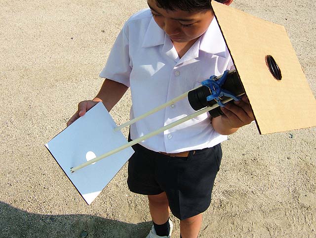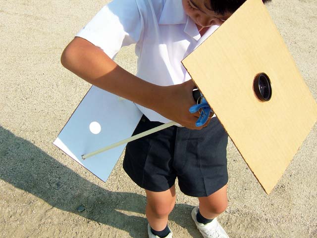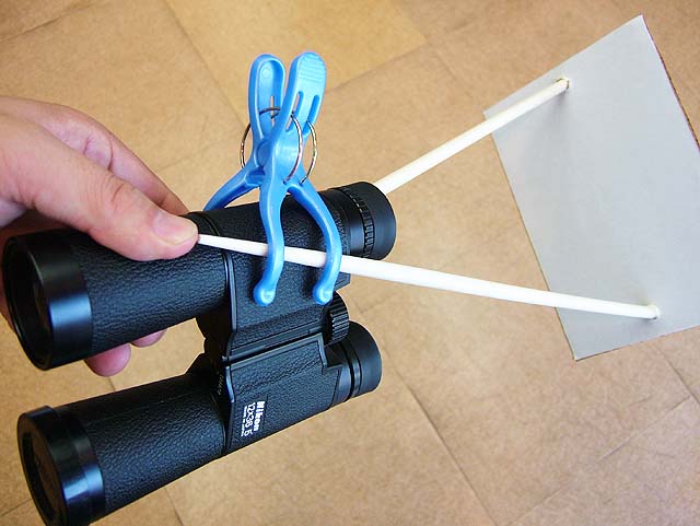 この方法は、天体望遠鏡でよくある「太陽投影板」と同じことを双眼鏡で行ったものです。