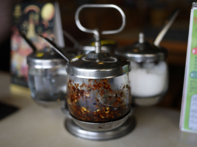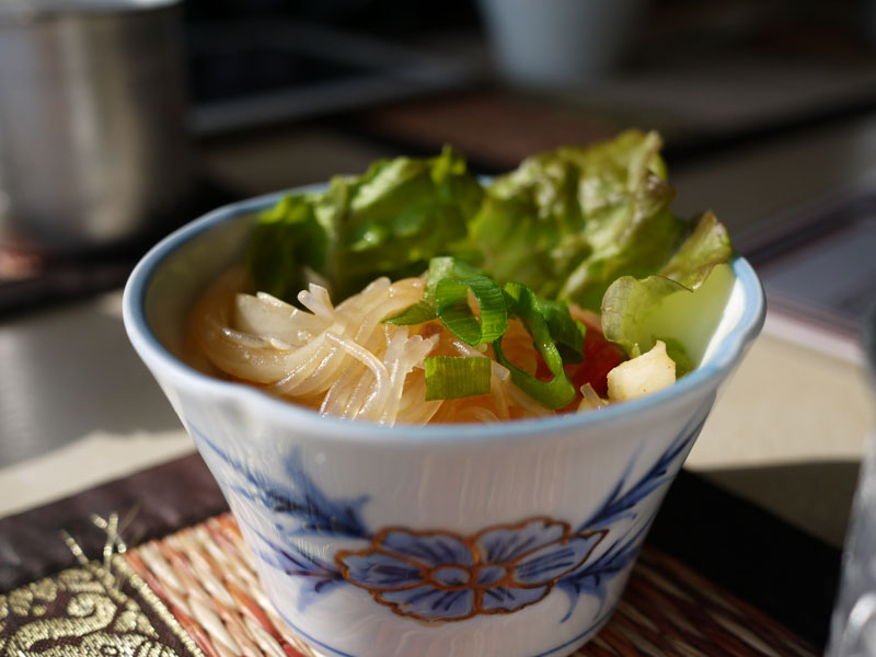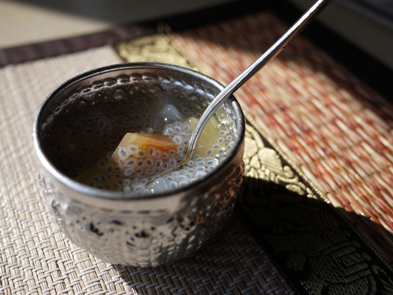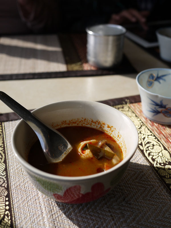 ランチは土日しかやってないそうなんですが、ちょうど土曜日でしたのでやっていました。 ランチタイムは単品はなく、ランチのセットメニューのみですが、それでも十分楽しめます。 まずはサラダ。 これは春雨サラダですね。 ぴりっとして美味しい。 セット内容によっては、スープとしてトムヤムクンが出てきます。 ここのトムヤムクンは美味しいです。 十分辛いし、魚介の出汁もよく出ています。 ボクは前回来た時に、辛い調味料を入れすぎて秒殺だったので、 今回は辛くないものをということで、米の麺料理です。 が、少し味が物足りないという話で、途中から例の辛い調味料をほんの少し入れたんですが、 そのせいでまた辛くなってしまって、またしてもノックアウトです。 しかし、入れたのは本当にほんの少しだったんですけどね。 この赤いのがその調味料。 一見食べるラー油のように見えますが、辛さはそれどころではありません。 はっきり言って危険です。 こちらはグリーンカレーのセット。 このグリーンカレーも美味しいですよ。 トムヤムクンと並んで私のお勧めです。 ランチセットなら、グリーンカレーにはトムヤムクンがつきます。 こちらは鶏肉の炒め物のセット。 ご飯の上に玉子が乗っていました。 これもなかなかいい味ですね。 ちょっと中華に近いようにも見えますが、味はしっかりタイ料理です。 デザートはいつものカエルの卵、 ではなく、バジルの種。 甘くて美味しい。 今回は天気も良くて、景色も綺麗でよかった。 次は夜来たいですね。
