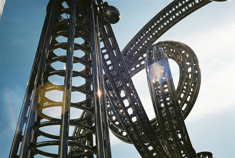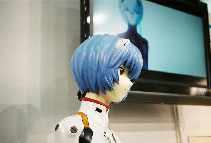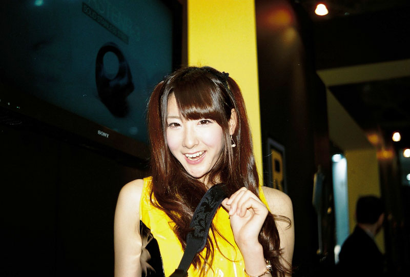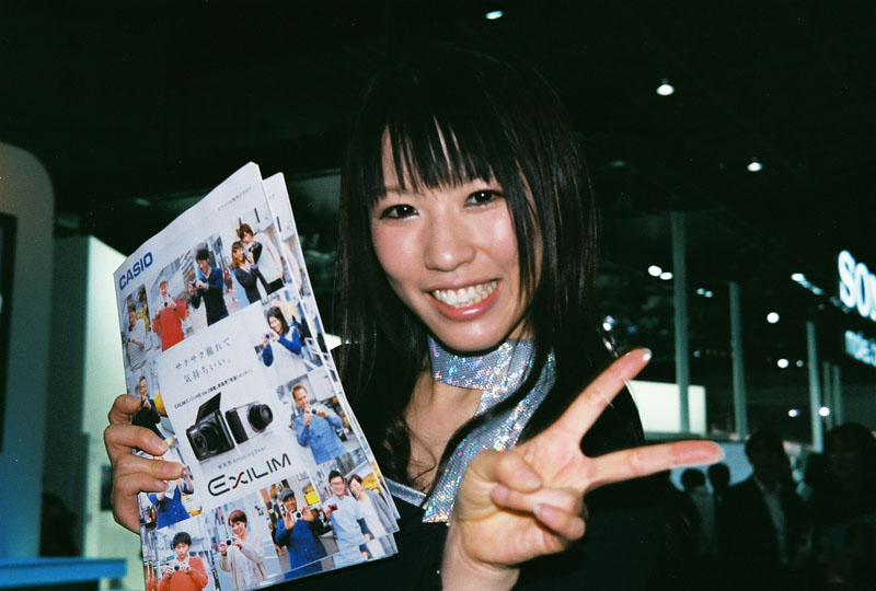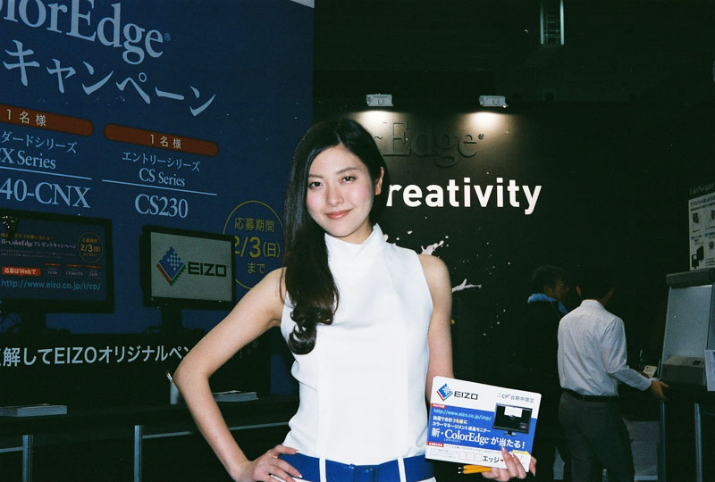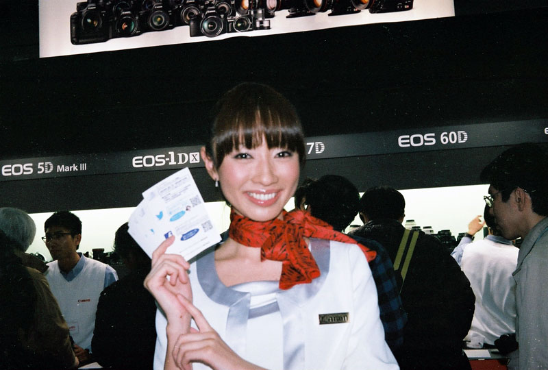 これは、みなとみらい、クイーンズスクエアのスターバックスから外に出るとあるオブジェ。おそらくうちの子には、エヴァンゲリオンの何かに見えているんだと思います。しかし、いいアングルで撮ってますね。今回ボクが持って行ったカメラはこれまでと同じく、フォクトレンダー ビトマチックIIb。フルマニュアルのフィルムカメラです。ですので当然ピントも露出も自分で合わせないといけませんが、このカメラには、性能の良い距離計と、セレンメーターがついています。これを使えばだれでも綺麗な写真が撮れるというわけです。こちらはランドマークタワー。正面からしっかり捉えたアングルは、ダイナミックな感じがしますね。これはそのランドマークタワーの足元にあるオブジェ。毎年これを撮っていますが、意外と飽きずに撮れるもんです。そしてボクが撮った中で最も多くを占めていたのがコチラ、はい、コンパニオンのオネェさんです。今回は寄って撮っていますね。コンパニオンのオネェさんの笑顔をよく捉えています。ブラックラピッドのブースには毎年行っています。そのせいでしょうか、コンパニオンの視線はちゃんとボクの方を向いています。しかし、ボクが一番撮りたかったのはこちらでしょう。ここのところエヴァにはまっていて、ペンタックスのエヴァンゲリオンモデルに興味津々です。それにしても、どの娘もボクの方に視線を向けてくれますね。しかも笑顔がとっても良い感じ。私が撮った時とまるで違います。これはブラックラピッドのブースが慣れていたのが原因ではなく、やっぱり子どもの方が受けがいいということのようですね。うちの子と並んでカメラを構えればよかったですね。じゃないとこんな表情は撮れません。しかしこれは寄り過ぎか。古いレンズですので最短撮影距離は1mです。寄り過ぎるとピントが合わなくなりますね。これは寄り過ぎと言うよりは、ピントをちゃんと合わせていませんね。ここのところ、近視の度が進んでしまって、ちょっと前にメガネを新調したのに、横浜には持って来なかったんですよね。それも影響しているのかもしれません。これもピンボケ。うーん、もったいない。せっかくいい表情を捉えているのに、惜しいなぁ。と言った感じのボクの撮影でした。最近はデジカメにも興味が出てきたのかも。でもフルオートでは面白くないよね。ではここで、プレゼントのお知らせ。今回もCP+での戦利品である用品年鑑をプレゼントいたします。ですのでカウンターを設定しましょう。今、167000を超えたあたりですから、「0168168」にしましょうか。キリ番とはいえないけれど、揃いそうな数字がないのでこれで行きます。それではみなさん、「0168168」目指してアクセスよろしくお願いします。