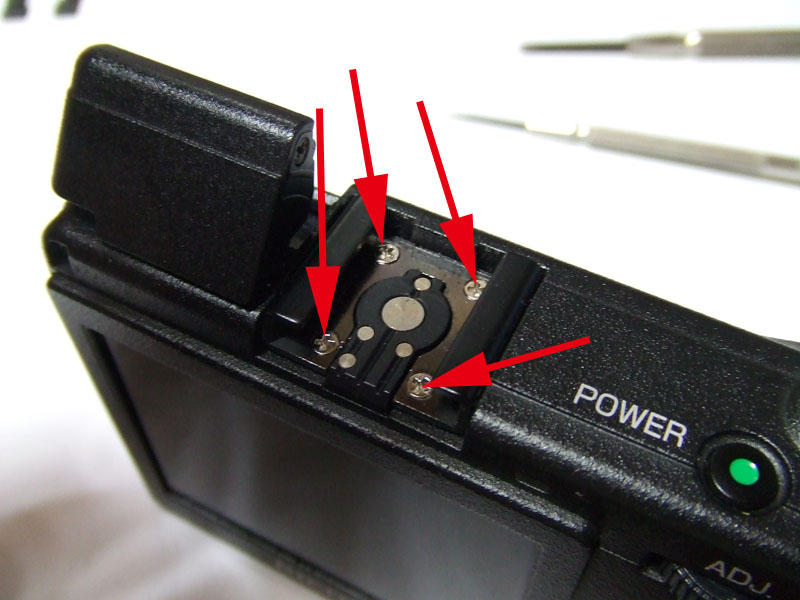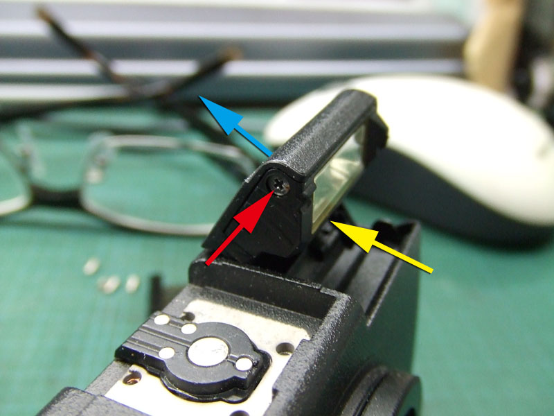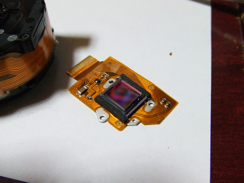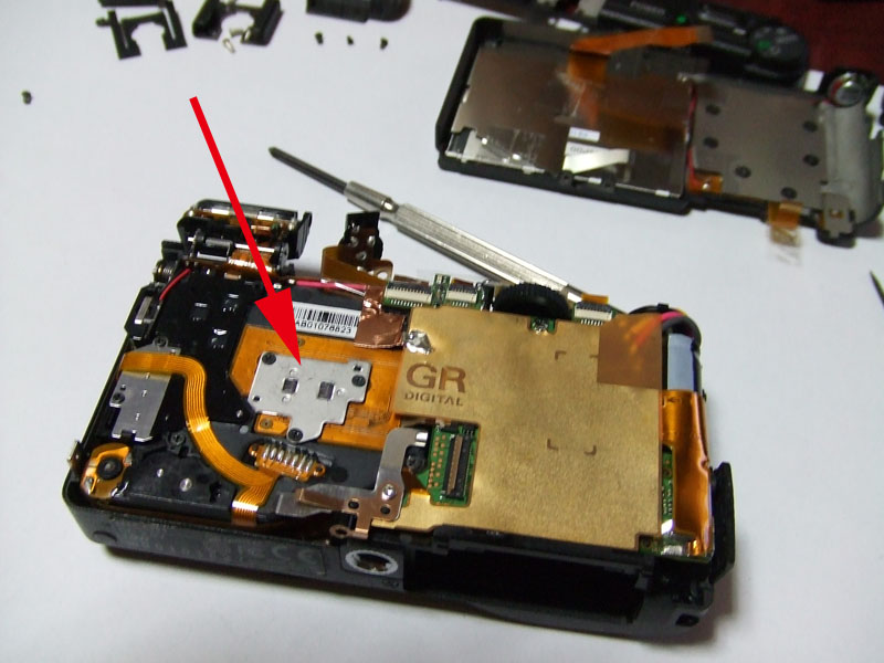 初期型の外見上の特徴は、一瞬ファインダーが付いているのかと勘違いしてしまうような、四角い窓が付いていることですね。それ以外は、その後の後継機とほぼ同じです。GRDを送ってくれたのは、このブログにもコメントを頂いているジャン亀さん。ジャンクとはいえ、送って頂いてありがとうございます。ジャンク内容はといいますと、SDカードが認識されないというもの。こういう不具合は回路の微妙な不具合の可能性がありますので、直りにくいんですよね。でも取りあえず内蔵メモリーは使えるようで、USBでパソコンにつなげればデーターを読み出すことはできます。が、10数枚しか撮ることができません。なので、やっぱりSDカードが使えるようにしたいところ。ではとりあえず、現状で試写してみましょうか。すると、撮像素子にゴミが有るようですね。それと、ファンクションダイヤルも反応していないようです。では分解決定ですか。分解する時は、フラッシュを上げておかないと難しいですので、ポップアップさせて。ホットシューのカバーを外してその下にある4本のプラスネジを外しましょう。そしたら次。ストラップ穴の奥に1本プラスネジがあります。そして右側面にも1本。そして、フラッシュの中の、矢印の一にも1本プラスネジがありますのでこれを外します。しかしこれだけではまだです。フラッシュユニットのカバーも外します。赤矢印のプラスネジと、黄矢印の発光部の下側にも1本、プラスネジがありますのでこれを外しましょう。そしてフラッシュユニットのカバーを、青矢印の方向に外します。少し爪が引っかかっていますので、それらを外しながら。これでやっと軍艦部?カバーが外れます。では次に、ボディーの前後カバーを外しますが、まずはグリップ部のゴムを剥がします。すると側面に、プラスネジが2本現れてきますので、それらを外しましょう。後は、反対側側面の下の方と、三脚ネジ周辺にも2本、それてもう1本、フラッシュの奥の方にも1本プラスネジがあります。これでカバーが外れました。矢印部が撮像素子ですので、これを外せば掃除ができます。でも今回は、各基盤の接続部も再確認したいので、レンズユニットごと外しましょう。で、こちらが外したレンズユニット。矢印の4本のプラスネジを外せば、撮像素子を分離することができます。はい、分離しました。見るとハッキリ分かるほどの大きなゴミが付いていました。では、これをクリーニングして。そしたら元のように組み直します。基盤の接続部が確実につながるようによく確認します。という感じでとりあえず完了です。恐る恐るSDカードを入れてみますと。おお!認識してくれました。しかしこのカメラはSDHCカードは使えませんので、最大容量は2GBまで。でもそれで十分です。では試写してみましょうか。おっ、なかなか良い感じに写ってますね。しかし、ファンクションダイヤルは、時々動きがおかしい時もあります。ま、そのくらいはいいでしょう。という事で、新たに散歩カメラが仲間入りです。と言いますか、これでうちの子用のGRD IIIを借りなくて済みそうですね。