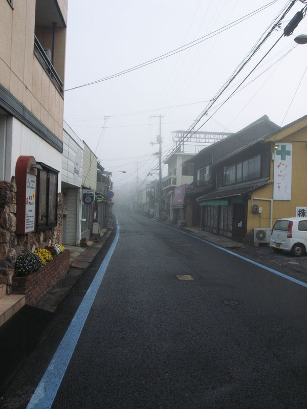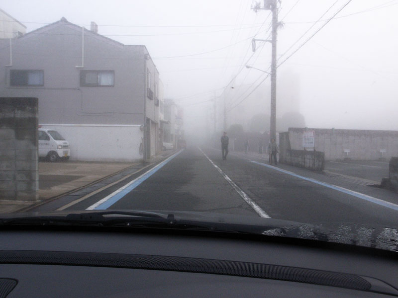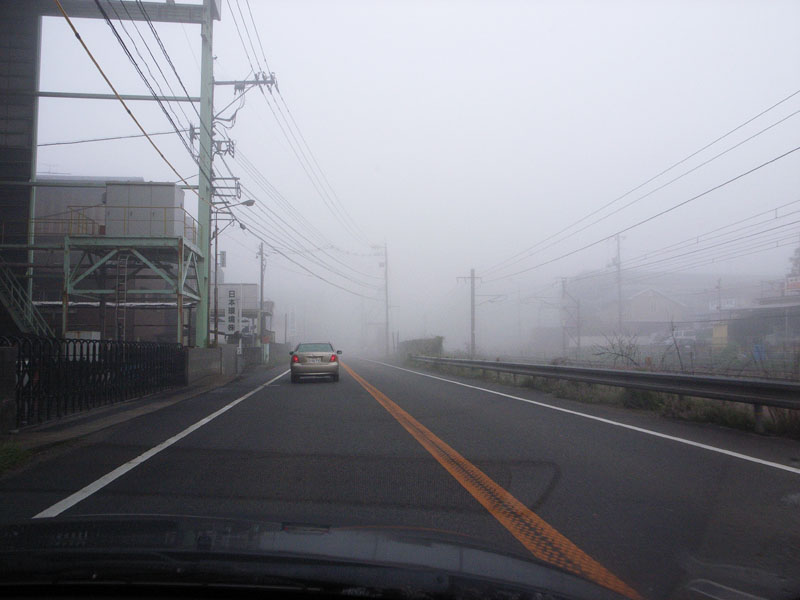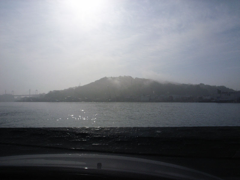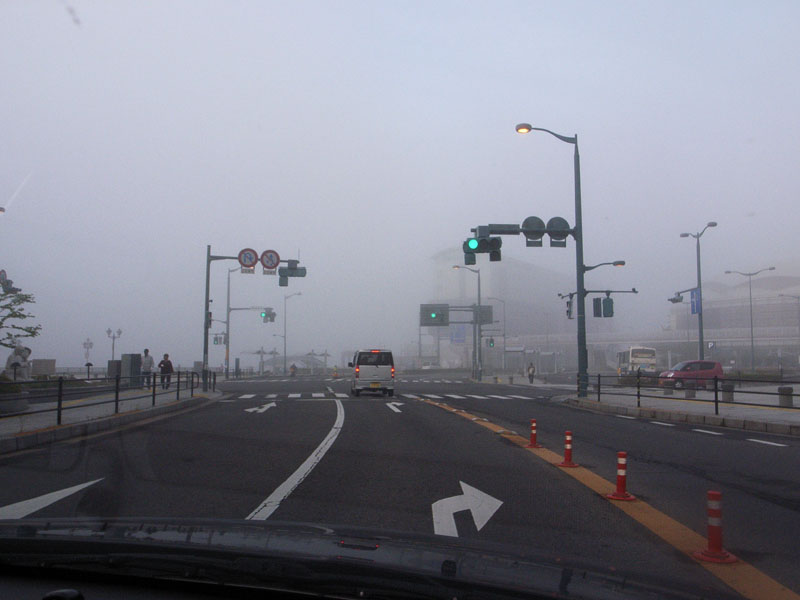 昨日の朝は、家から出てみるとすごい霧。これはもしかすると渡船も止まってるんじゃないのかな、と思ったものの、とりあえず桟橋まで行く方が早いかという事で、移動することにしました。道路にも霧が立ち込めてます。
