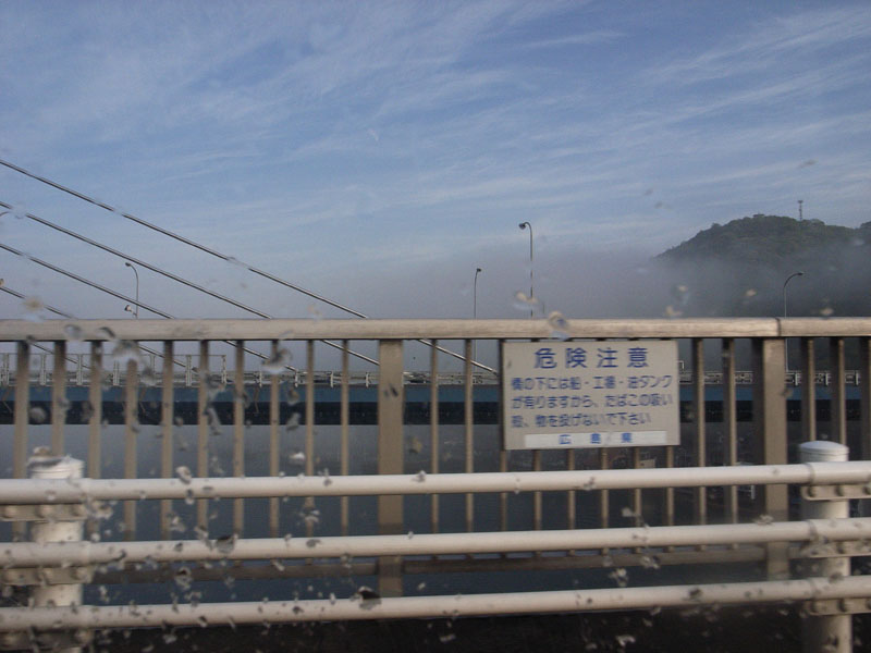 駐車場に行ってもこのとおり、よく言えば幻想的。しかし状況的には緊迫してます。問題は渡船が動いているのかどうか。そう言えば、3年前にも同じ事が有りました。渡船の桟橋近くに来ると、霧はより一層濃くなって来ましたね。渡船が動かないとなると、尾道大橋を渡って尾道駅までうちの子を連れて行かないといけなくなります。しかし渡船が動かないということは、いつも渡船に乗っている人たちがみんな橋に回ってくるということです。となると橋は大渋滞の可能性もあり、そうなると電車に間に合わなくなる可能性も有るわけです。で、桟橋まで行ってみると、やっぱりですか、渡船は欠航。仕方が有りません。尾道駅まで行きましょう。しかし橋の周りは霧がほとんど有りませんね。でも海岸付近は深い霧です。これは尾道大橋の下。この辺りまでは霧は全く有りませんが、ここから西に向かって深い霧です。ですので尾道駅周辺もこのとおり。まぁ、対応が早かったので、橋が渋滞することも有りませんでした。これなら電車にも余裕です。が、今度はなんですか?電車が動いてない?霧のせい?ではないようです。どうやら尾道糸崎間で人身事故。その影響で上下線共に不通なのだとか。おいおい、それじゃぁいつ開通するのかわかりませんね。仕方がない、ここまで来たついでです。学校まで車で送っていきますか。でも同じ状況の人がいるのなら、ここもまた渋滞になる可能性もありますよ。と思ったものの、意外にも道は全く混んでおらず、いつもの時刻より早く学校に着いてしまったのでした。うちの子を送って尾道に帰ってくると、まだ霧は少し残っていましたが、もう渡船も普通に動いていました。