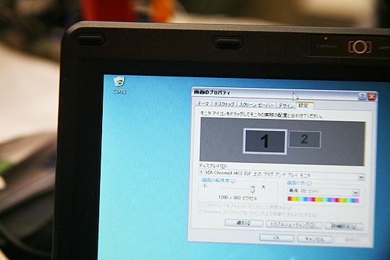 前回の記事でタッチパッドとボタンが一つの部品で造られていて少々使いにくいと言うことを書きましたが、 こんな感じになってるんですね。 デザイン的にはすっきりしていい感じなのですが、左右のボタンは押しにくいです。 と言うか重いです。 タッチパッドのスクロールさせる部分が分かり辛かったので、写真を見て分かるでしょうか、スコッチテープを貼ってみました。 これ結構快適です。 OSはWindows XPがバンドルされています。 動きはちょっともたもたします。 例えばファイルを削除したい時に右クリックして「削除」を選んだりしますよね。 その右クリックしてメニューが表示されるまでが時間が掛かったりします。 一度やれば速くなるんですが。 Linuxだともたもた感はほとんど感じませんし、タッチパッドも快適です。 このパソコンとXPのマッチングが良くないのかも知れませんね。 それから画面の解像度ですが、この8.9インチの液晶の表示画素数が、1024x600と言うことになっています。 ですが画面のプロパティーでは最大で1280x800まで設定可能です。 では実際に設定してみましょう。 まずこちらは1024x600のスクリーンショットです。 クリックすると別画面で表示されますのでご確認下さい。 そしてこちらが1280x800に設定した時のスクリーンショットを1024x600にリサイズしたものです。 とりあえず字は読めます。 この画像では少しボケたようになってますが、実際にはもう少しシャープに見えます。 よく解像度を上げ過ぎると文字がにじんだりしますが、この機械の場合そういう感じじゃありません。 字が小さすぎて見えにくくなると言う感じです。 画面を撮影するとこんな感じです。 画像をクリックして拡大してみて下さい。ほぼ見た感じに近い状態です。 ですので、1280x800でも目はかなり疲れると思いますが、使えなくはありません。 複雑な漢字は読めないかもしれませんけど。 と言うことで意外と遊べる機械です。 せいのカメラ店では、引き続きCloudBookを激安販売中です。 こちらもご参照下さい。 CE1220J:¥24,800 CE1210J:¥19,800 CE1200J:¥22,800 お問い合わせは下記まで -------------- せいのカメラ店 0848-44-4430 seino@bbbn.jp ---------------