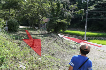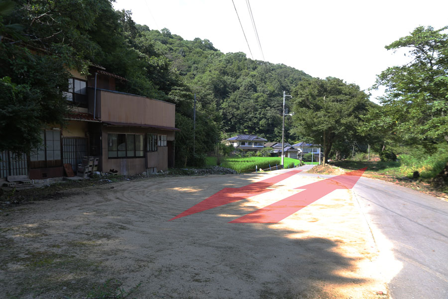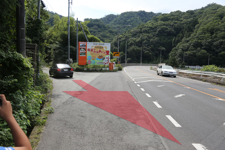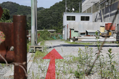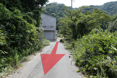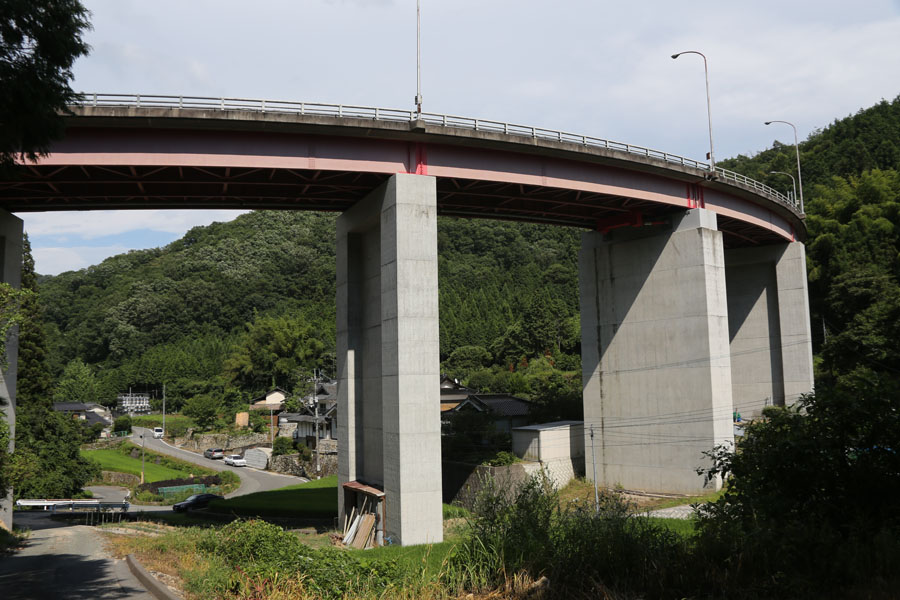 そして一旦奥まで進んで、今度はバックする形で右上に登っていくわけです。この方式をスイッチバックと言います。もう少し引いて見るとこんな感じです。 おそらくこの広くなった所が諸原駅跡でしょう。左下から上がってきた電車は、諸原駅に入った跡、右上に登っていくわけです。反対側から見てみましょう。 右から登ってきた電車が駅に着いた後、バックする形で左から手前に登って来るんですね。そしてこの先は、 工場の敷地に入っていって、今は勝手に入ることができません。 その工場を過ぎると、どんどん登って行き、 この先で184号線と合流するというわけです。この場所は尾道から行くと、峠を超えて下りはじめたところ。 今は184号線の高架ができていますが、このスイッチバックにつながる道路は、旧184号線ですね。スイッチバックというと、山岳鉄道などでよく聞きますが、尾道にもあったというのは面白いですね。