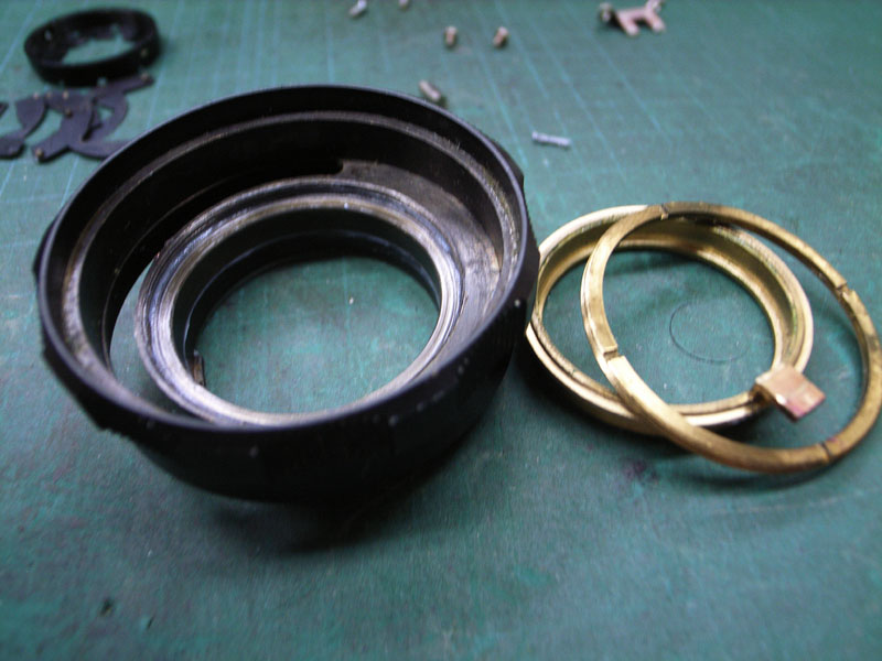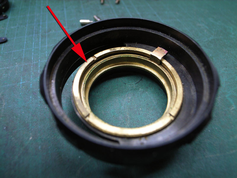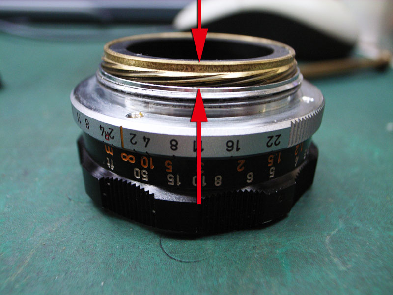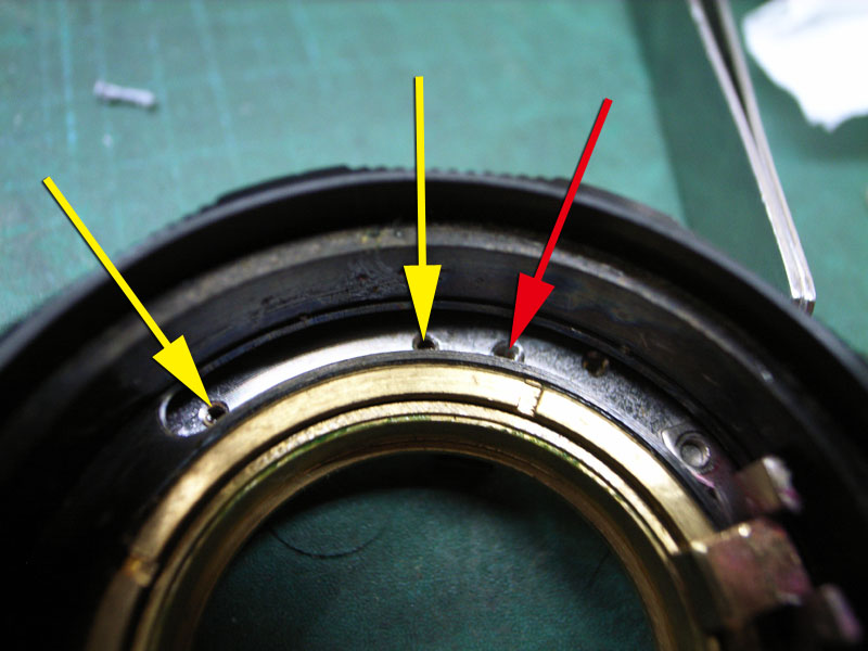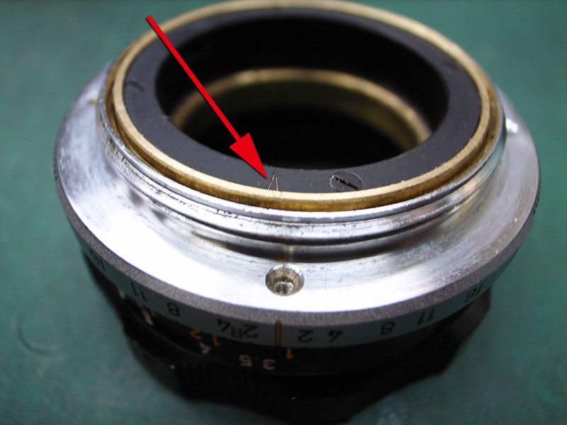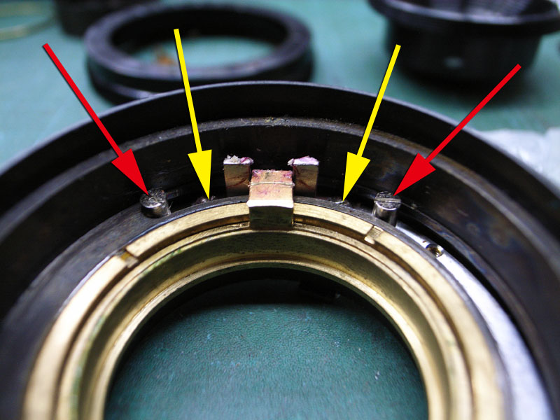 これまでに何度も書いていますが、レンズのヘリコイドというのは普通のネジとは違います。普通のネジは一本のネジ山がグルグルと回っているんですが、ヘリコイドの場合は数本のネジ山が等間隔でグルグル回っているんです。ですので組み付ける位置によってピントが合わせられなくなってしまうことも有るんですね。ですので、バラす前に、どのように組み付けられているかを調べておくと後々便利なわけです。ではまず、距離系連動用のヘリコイドから。ピントリングが無限の状態では、 距離系連動部分がこれだけ突き出しています。そして最短撮影距離に合わせると、 ここまで引っ込みます。これがズレてしまうと、距離計とピントがズレてしまって大変です。で、例えば最短撮影距離にした時の位置が分かるように、印を付けておくといいわけです。 が、以前にバラされたのでしょうか。それともたまたま付いたのか、ピントの指標位置に印がありました。これが分かっていれば、これと同じ位置になるように組めばいいわけです。ということでこれで気兼ねなくバラせます。続いてピント用のヘリコイドです。 レンズの前側から見ると、このように、ピントリングのストッパーピン(赤矢印)が2本と、レンズ位置決めの部品を留めているマイナスネジ(黄矢印)が2本ありますので、これらを外します。そしたら、ピントが無限を超える方向に締め込んでみます。 そして回らなくなったところの位置を確認します。今回の場合は、このように、左側のストッパーピンの締結部がちょうど隠れる程度まで回りました。そしたらこのヘリコイドも気兼ねなくバラしましょう。そして最後に、 位置決め用のリングも外します。これはハマり位置は特にありませんのでカニ目ネジを普通に外せばオッケーです。 こちらが位置決めリングが外れた状態。ではばらした部品をすべて洗浄して、可動部にヘリコイドグリスを付けて、さっき確認した位置になるように組み付けましょう。これでヘリコイドもいい感じになりましたね。ではこれを、レンズと合体させれば、キヤノン35mm,F2の修理、完了です。
