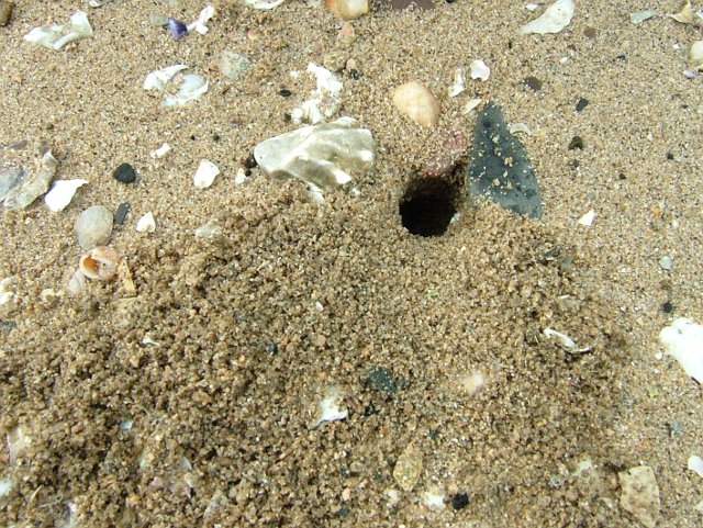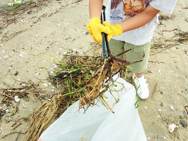 昨日までかなりの雨が降って警報が出るような天気でしたので、 なんだかヘドラの海のようにもなっています。 でも、海に浮いているものまで集めることもできませんので、清掃の対象は砂浜にしときましょう。 砂浜を見ているといろいろなものが目に入ってきます。 このくぼみは何でしょうか。 うちの子が言うには恐竜の足跡だそうです。 確かにそんな風に見えます。 こちらには、 シャコだかカニだかの巣穴があります。 海岸がきれいになってきたことが実感できます。 ところで、清掃の方はと言うと、 ちゃんとやってますよ。 流れ着いたごみも拾ったし、流木も拾いました。 作業前の状態と比較する画像がありませんが、きっと海岸もきれいになったことでしょう。 清掃イベントの時だけじゃなく、時々この浜にも遊びに来てもいいかも。