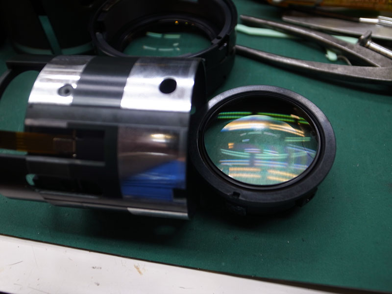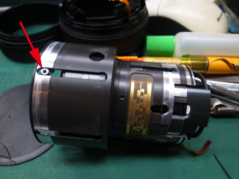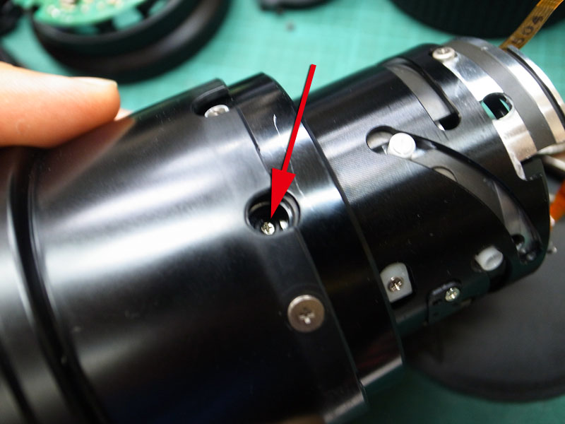 留めてある相手が中に落ち込んでしまいそうです。そうなるともしかしたら組めなくなるかもしれません。では他に手順が有りますか? このへんのとか、 このへんのとか、 これもかなぁ? ここなんか更に怪しい。まるで外してくれと言わんばかりにサービスホールが用意されている。と思って、まずはここを外したものの、中のレンズが自由に動くようになっただけで、外れるわじゃない。じゃぁ仕方が有りません。ズーミング関係の位置決めパーツを片っ端から外してみましょう。が、これも効果なし。やっぱどう考えても最初の写真のプラスネジしか有りません。と言うか、もうここしか残ってないし。相手が中に落ち込んでも、バラせれば回収できるか。でも組む時は?それは組むときに考えましょう。ということで、 この接点も引っかかりそうなので外しておいて。例のプラスネジ3本を外しましょう。すると案の定、相手は中に落ち込んでいったのでした。 でもとりあえずこの通り、外れましたよ。やっと前玉が取れました。矢印の部品が、かろうじて落ち込まなかった相手部品。でもネジを挿したら落ちるはず。これでやっとレンズが外せそうですよ。 外側の筒を分離して、更にヘリコイド部を外します。 それでもまだ目的のレンズは外れません。残された筒の中から、 更にレンズを外して、 このネジを取れば、絞りユニットと一緒になった真ん中のレンズが出て来るはず。しかし、まだまだ先がありますね。