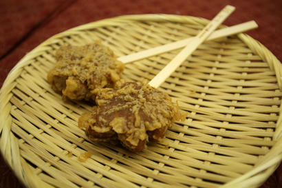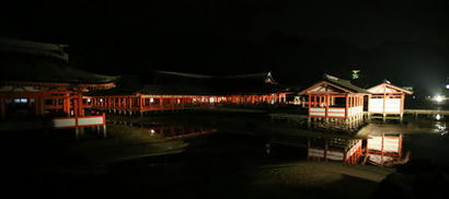 では我々も宮島へ。いや、その前に、この時間から宮島へ行っても飯が食えないかもしれません。しかも宮島口でももう店が閉まり始めてますよ。ではまずは腹ごしらえ。 なんとかまだ開いていた、さくら庵城山さんへ。牡蠣と穴子が載った丼を頂きます。ではでは腹ごしらえも終わったことですし、宮島行きの船に乗りましょう。するとですね、 どうやら対岸は明るそうですね。コレなら大鳥居ぐらいは楽しめそうですよ。ところが、宮島に着いてみると、意外にも多くの店が開いていました。 これはやっぱり、修学旅行生のためなんでしょうね。どの店も修学旅行生で賑わっています。 それ以外にも、というか、当然ながら、夜の商店街というのはきれいなものですね。 宮島にこんな風景があるというのが意外な感じです。 そして、ここも開いてました。揚げもみじ。 これは逃す手はないでしょう。で、肝心の風景の方はどうかというと、 灯籠にも灯りが点いて、なかなか趣が有りますね。修学旅行でこんなところに泊まるのもいいかもしれません。で、更に進むと、 見えました大鳥居。ライトアップされて綺麗に赤が浮かび上がっています。そして厳島神社も、 おお。なかなか綺麗。これは撮影目的で来てみたいですね。今回はそんなに滞在時間が取れませんでしたのでここまででしたが、紅葉も含めて色々楽しめそうです。 夜なら鹿もおとなしいし。