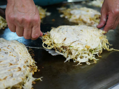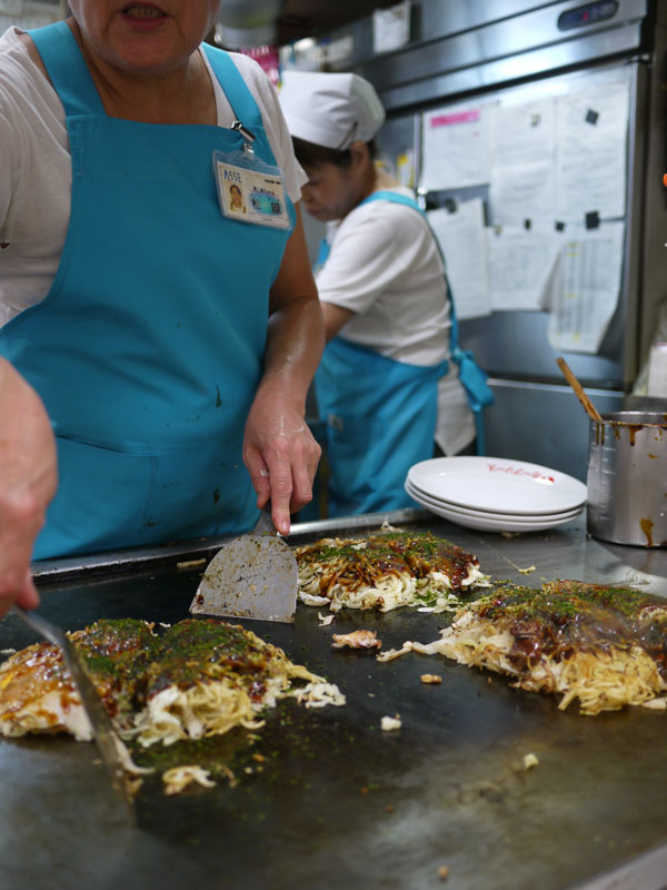 もちろんお好み焼きは日常的に食べてます。ですのでそれは、よそに行ってまで食べるものでもないですし…でもたまには食べてみるのもいいもんです。と言うことで今回は、広島駅ビルにある麗ちゃんへ。麗ちゃんといえば結構な有名店ですが、私自身のことで言えば、もしかしたら行ったこと無いのかも。いや、行ったことあるのかもしれないけど、もうずっと昔のことで記憶から削除されているのかも。そういう意味もあって、実は新鮮に感じました。 目の前の鉄板では、手際よくお好み焼きが作られていきます。これだけいっぺんに作って、よく失敗しないものだと感心してしまいます。私が作ると、一個でもなかなかうまく行かないのに。 切込みが入ってソースが塗られると、そろそろ出来上がりですね。 形は雑な感じではありますが、でも美味しそう。鉄板で食べる人が多いですが、私は皿が好き。 では頂きましょう。うん、おいしい。私の持論ですが、美味しいお好み焼きは卵の焼き加減がいいと思います。口にふくむと、ふんわり卵の香りが広がります。いやぁ、食べに来てよかった。 今回お邪魔したのは、おばちゃんが焼いてくれる第二の方です。個人的にはこっちの方が美味しい気もします。