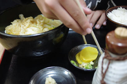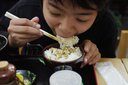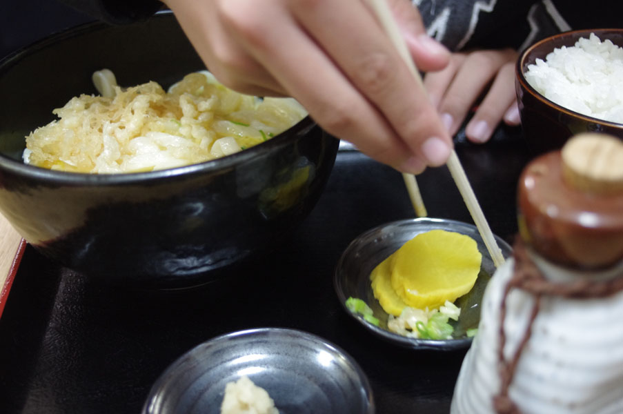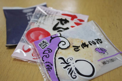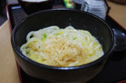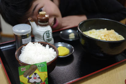 私は白ぶにが一番好きなんですが、そういうこともあって、赤ぶにとなると、それこそいつから食べてないのか…しかしいつ食べても美味しい。辛くて汗だくになって食べている方もおられますが、私にはいいくらいの辛さです。そしてうちの子はと言いますと、 今回は釜玉。プラス、ご飯。 ご飯にはフリカケのおまけをもらいました。だがしかし、 ネギ抜きって言ったのにね。ご丁寧にネギ分離中。分離が終わったら食べますか。 ちゃんと左手で茶碗を持って下さい。うん。今回も美味しいうどんをただくことができましたね。次来る時は何にしようか。特別メニューで焼きうどんて言ってみたんですが、やっぱちょっと難しいみたい。そして今回もFacebookチェックイン特典、 アイスを頂きました。それと、 おみやげ。たこせんはやっぱりゑびす家さんのが美味しいね。じゃぁまた来るね。