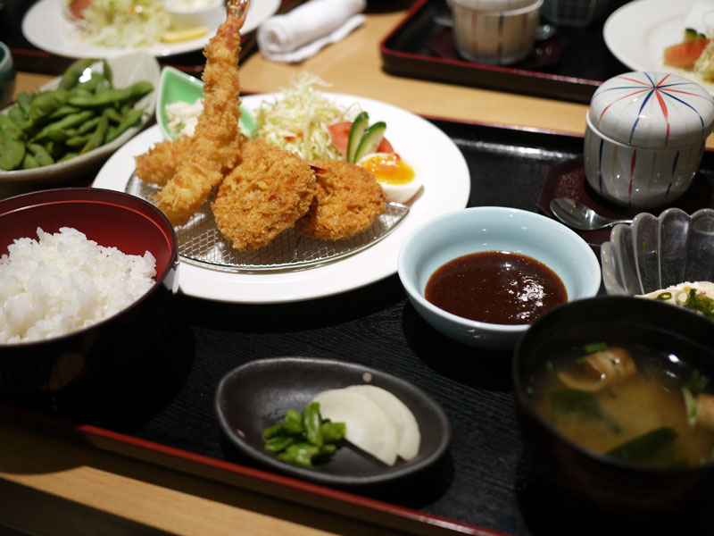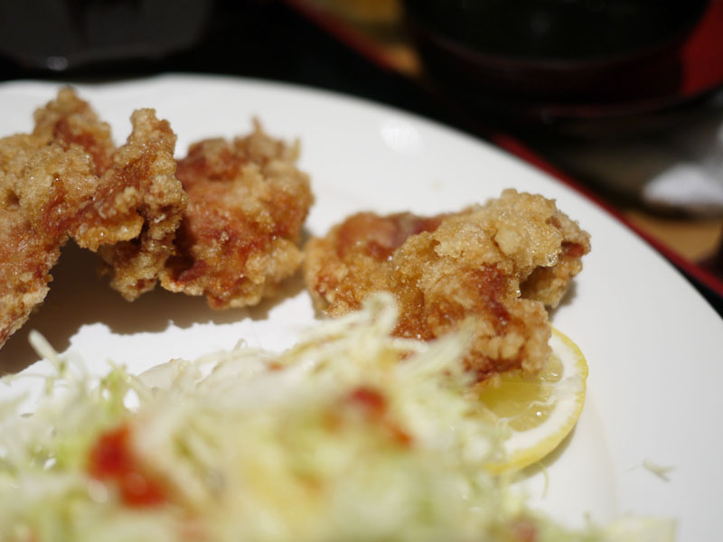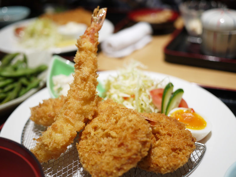 ま、その前にビールを頂きましょうか。 それと枝豆。で、私が今回頼んだのは、 ヒレカツエビフライ定食。ヒレカツもエビフライも、衣がサクサクで美味しい。定食は、このおかずに、御飯と味噌汁と、自家製豆腐の冷奴と、 茶碗蒸しが付きます。これだけでお腹いっぱいです。他の面々は、 唐揚げ定食。 とんかつ定食。うーん、どれも美味しそうですね。唐揚げもしつこくなく美味しいんですよね。私も唐揚げ定食にすればよかったかな。でも今までヒレカツエビフライ定食は頼んだことなかったからコレにしたんですよ。いや、やっぱりうな丼にすればよかったかも。うー。かんがえているだけで他のも食べたくなってきてしまいます。でももうお腹いっぱい。はい、後ろ髪を引かれながら帰りましょう。