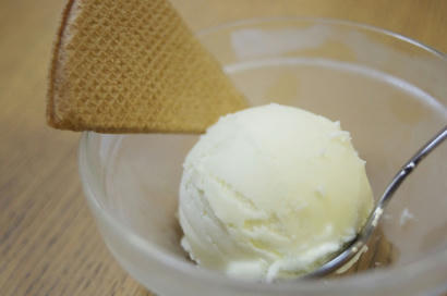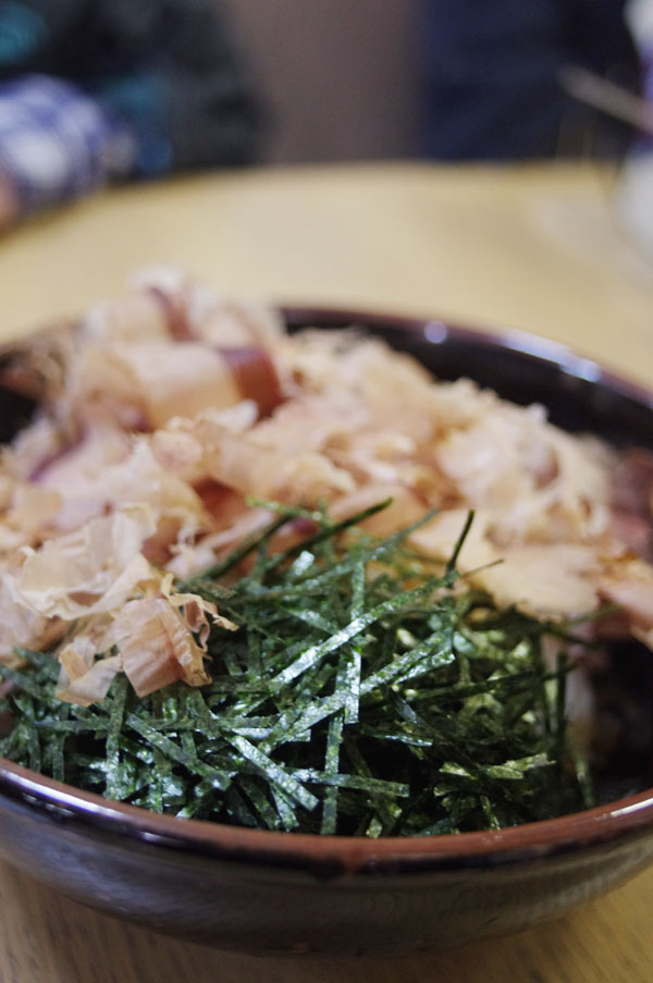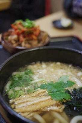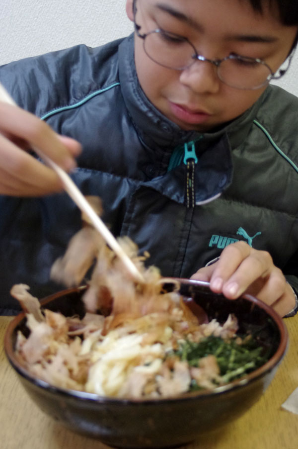 私は前回は赤行きましたので、今回はどうしましょう。やっぱり牛丼を食いたいので、ミニ牛丼をプラスする形で、 かやくうどんにしときましょう。今回のかやくうどんは、油揚げと、ワカメと天カス。シンプルですけどなかなか美味しい。かやくうどんはその都度トッピングが変わるのが楽しいですね。そしてミニ牛丼には、 キムチ美人本舗さんのキムチを載せてもらいますよ。これが美味しいのです。そしてうちの子はというと、 カツオ冷やしぶっかけ。これは初めて頼みますね。ぶっかけうどんに、大量のかつお節とのりが載った感じのシンプルなうどん。これはこれで美味しそうですね。 ボクも美味そうに食べてます。感想を聞くと、かなりいけるんだとか。調子に乗ったボクは、もう一杯おかわりしてますが…ホントにそんなに食うのか?しかし2杯目もペロリとたいらげました。よっぽど美味しかったのね。で、今回は開店1周年記念ということで、 こんなの頂きました。そしてもちろんFacebookのチェックインで、 アイスクリームも頂きました。今回も美味しいうどんをありがとう。