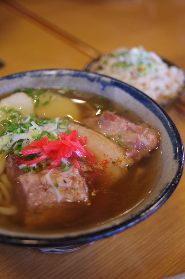 しかし乗ってみると、 ガラスキ。真ん中の列は誰も座ってない。しかも窓際も飛び飛び。こんなに人が少ない飛行機に乗ったのは初めてかも。コレなら後ろの人を気遣うことなく、リクライニングし放題です。ではゆっくり外の景色でも楽しみますか。 しかーし、出発してから到着するまで、ずっと雲があって景色に変化なしでした…残念。で、どこに行ったかといいますと、 沖縄。と言うことでまずは昼飯にソバでも食いましょう。 ついでにジューシーもね。で、ここ東江そばは、自家製麺なんだそうです。では、三枚肉とソーキが入った「東江そば」を頂きましょう。このパターンはどこの店でも概ねメニューに店の名前がついてますね。あ、これちなみに「あがりえ」って読みます。ナイチャーの皆さんはわからないかも。では頂きます。 麺はさすがに自家製麺という感じで、平均的な沖縄そばの麺よりコシがあって表面がツルッとしています。うん、なかなか美味しい。ですけどスープは、油が強いかな。味は濃い目で悪くないんですが、油の感じが強くて沖縄そば特有のさっぱり感がスポイルされてるように思います。三枚肉とソーキはなかなか美味しい。うーん、スープがもうちょっと自分好みだったらいい感じだったんですけどね。麺とソーキは美味しいので少し残念。それと、ジューシーもおいしかったですよ。味はしつこくなく、ご飯もねっとりしていない。もしかしたらここのスープとの相性で考えるとベストマッチなのかも。