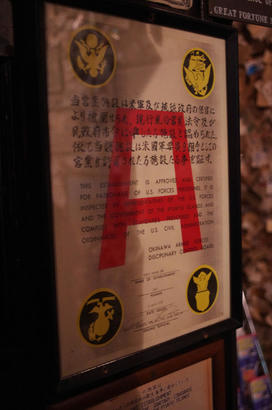 沖縄がアメリカに統治されていた時代に米軍の基準をクリアしたお店に発行された許可証。
