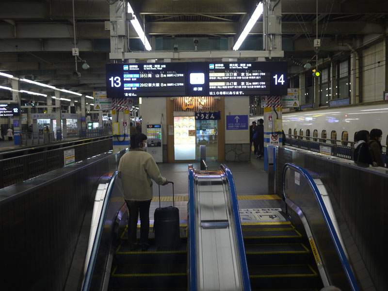白クマも食べ忘れてましたので、どっちがいいかなと思ったんですが、本格的な白クマはやっぱり無いみたいですし、現地で食べるさつま揚げはやっぱ美味しいんですよね。と言うことで、さつま揚げひと皿250円。うちの子と分けて食べましょう。醤油もかけて。もちろん醤油は鹿児島の醤油。甘いです。でも生姜と一緒に食べるとこれがウマい。ビールも欲しくなるけどチョットここは我慢して。ではそろそろ時間です。16時ちょうど発の新幹線に乗りますよ。本当は800系に乗りたかったんですけど、広島まで直中はN700系だけですね。 駅に入っている車両を見ても、N700系ばっかり。ではでは出発。鹿児島中央を出ますと、熊本に停車するだけで、一気に博多まで行きます。博多に着くと、 おお、隣のホームに停まっている800系がチョットだけ見えました。やっぱ800系カッコいい。何とか見ることだけはできましたので、結構満足。しかし新幹線は速いです。出発から2時間20分余、18:21には広島に着いてしまいます。が、ここからが問題。広島からこだまへの乗り換えが長い。次のこだまは、18:51ですか。30分待ち。 仕方がないので、ホームの待合室にでも行っときますか。そしてやっと来たこだまに乗りますが、三原でまた乗換えです。新尾道まで行けばいいと思うかもしれませんが、うちに帰る場合は新尾道駅では不便です。在来線の尾道駅まで行きます。しかも、今回は三原駅のコインロッカーに不要なものを預けて行きましたので、それも取り出さないといけません。19:19三原到着。本来なら19:25発の在来線に乗ればいいのですが、一旦改札を出て、コインロッカーから荷物をとって、またホームに上がらないといけません。果たして6分以内にそれが可能か。新幹線が着いたら、急いでコインロッカーへ。追加料金600円。だがしかし、すべて100円玉で払わいといけません。財布には100円玉が有りません。仕方がないので近くにある自動販売機で飲み物を買って、お釣りで…が、それでも100円玉4枚ですか。自動販売機のいじわる。必要ないときは全部100円玉でお釣りを出すくせに、こういう時は500円玉を出すんですね。仕方がない。もう一本飲み物を。これでやっとロッカーから荷物を取り出せました。はい、もちろん、25分の電車は出た後です。では次の電車はと。31分糸崎行きが有りますね。糸崎止ですが、そこから乗り換えがあるでしょう。と思ってその電車に乗りますと、車内アナウンスが有りました。糸崎からの乗り換えはなく、尾道から先に行きたい場合は次の電車に乗れとのこと。そうですか、仕方がないですね。じゃあ次のにしましょうか。で、次の電車は何分ですか?……19:59。マジですか。また30分以上待ちですか。 やっぱ車で三原まで来ればよかったか。しかたがないので待合室で待ちます。そしてそして、やっと尾道駅に着いたのは、20:12。 渡船を渡って、ふう、やっと帰りつきそうです。しかし、鹿児島から広島までより広島から向島までの方が時間が取られるとは…