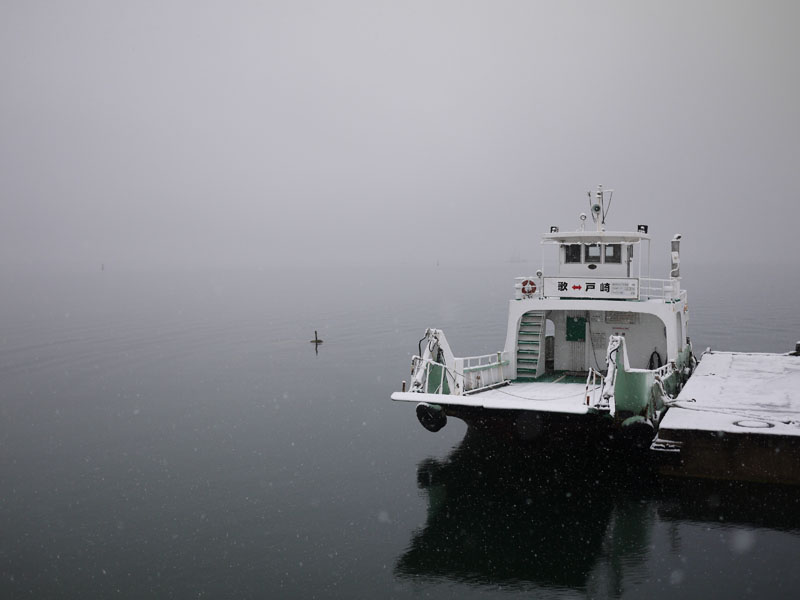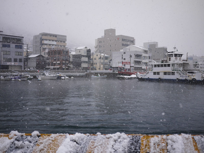 まさか、瀬戸内海の島に訪れた降雪とは思えないでしょう。もしかして、車は乗れなくなってるとか? これなら十分乗れます。しかしね、今日から泊まりがけで撮影に出ないといけないんですけど、実行可能?とりあえず集合してみる? うちの店の前もこんな感じですが…でね、集合場所というのは弓削なんですよ。弓削に行こうと思ったら、まずは因島まで行かないといけない。だがしかし。 しまなみ海道通行止め。因島へ行く道は絶たれました。じゃ後は、三原から生名まで船で行くか?でも三原までちゃんと行けるのか?まあとりあえず、できそうなことをやるしか無いか。ではとりあえず向島から尾道に渡ろう。 しかし、目の前でおっちゃんのカブがコケました。そりゃコケるよ。バイクおこしておっちゃんに大丈夫か聞いたんですが、大丈夫だって。じゃあまあいいか。 渡船から見た尾道もこんな感じ。と、そこでふと思いついたんです。船は?と言うのも、今回の企画は、チャーター船で上島町の島々を渡るもの。であるなら、そのチャーター船で迎えに来てもらうのが一番いいのでは?と言う話を連絡して、しばらく待っていますと、それは可能という返事。歌の桟橋に迎えに来てくれるとか。おお、一気に解決。これで参加できますね。では歌の桟橋に行って、迎えの船が来てくれるのを待つとしますか。 歌に行くと、すごい凪。まるで海が凍ったみたい。雪による陸上の混乱がウソのようです。雪が降っても海はなんにも変化なし。船は普通に走るんですよね。