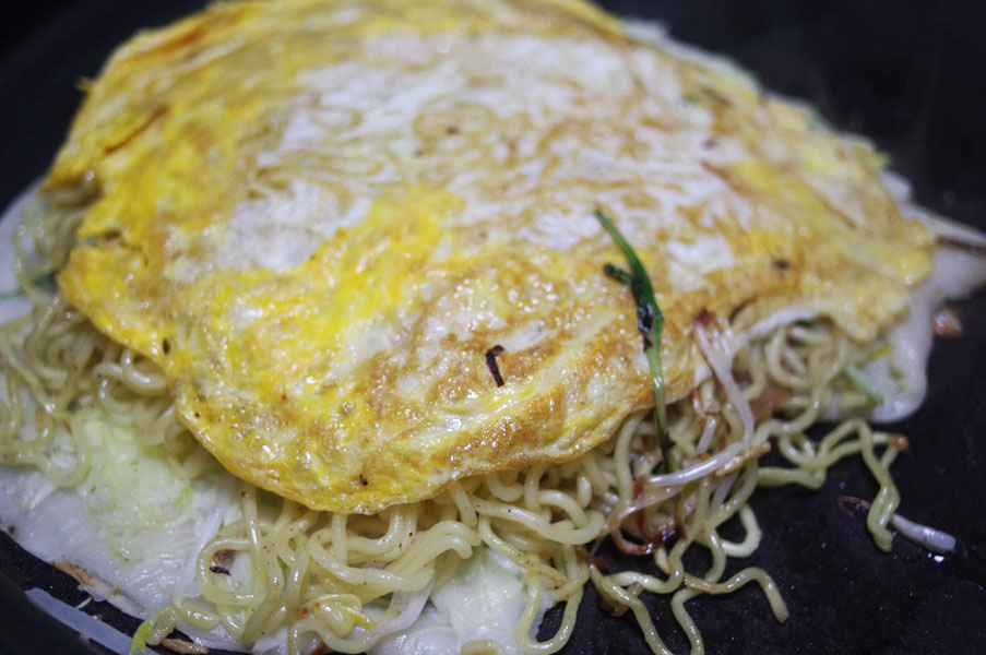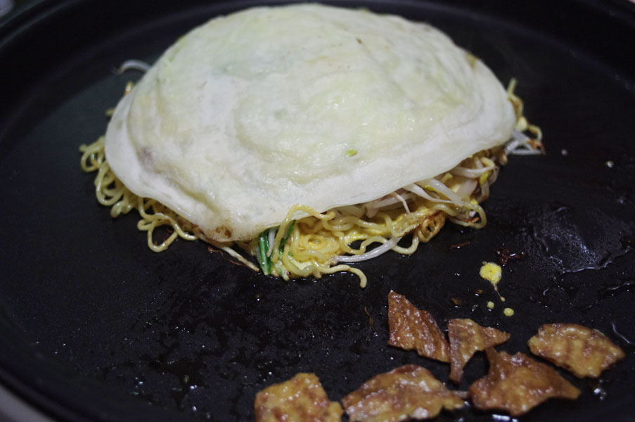 では卵が固まらないうちに、そばに載った状態のお好みを載せましょう。
