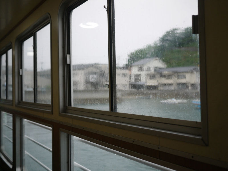 渡船の窓も雨に濡れています。
