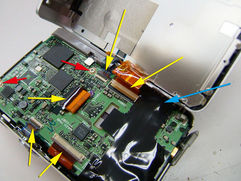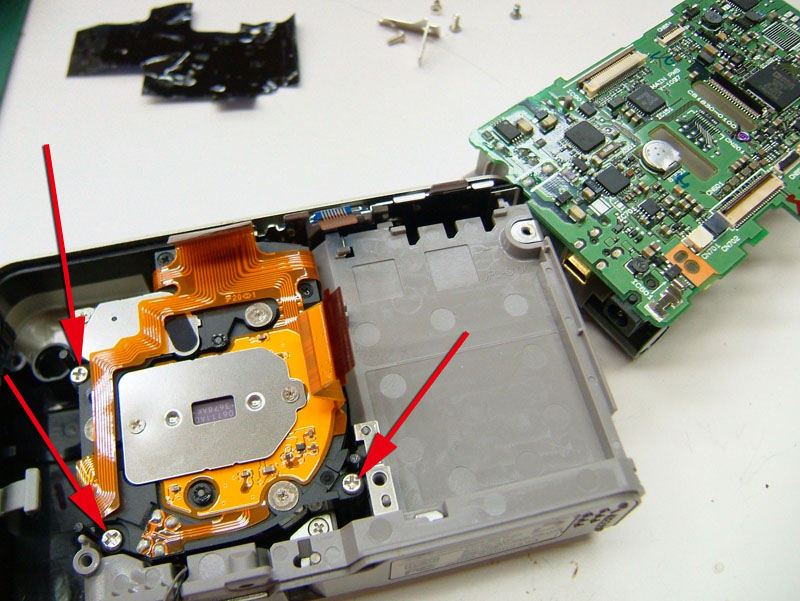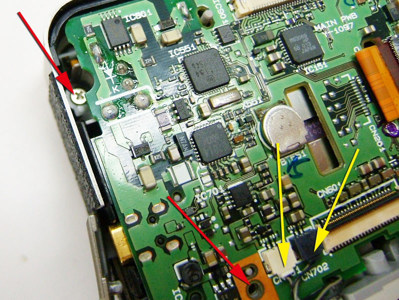 デジカメの前面に付いているものを外す時って、十中八九ほとんど分解しないといけないんですよね。これも多分そうなんでしょうね。しかも締結方法がネジならいいですが、焼き留や圧着だったら更にめんどくさい。しかもしかも、外した跡がフラットじゃなかったら…だからカッコ良くなる予想はできるものの、そんな面倒なことはやりたくない。 だって、バラそうと思うとまず外側カバーを外さないといけない。底面にある4本のプラスネジ。三脚穴に近い2本と残りの2本で長さが違うし。 側面のネジは特殊な頭。まぁ工具は有りますけどね。 それにせっかく貼った革を一部剥がさないといけないし。これらのネジを外したとしても前面カバーが外せるわけじゃないんですよ。 外れるのは背面カバーだけ。ここからもっとバラしていかないといけないから、さらに面倒になる。まずは黄矢印のフィルム基板をコネクターから外す。5箇所。それぞれロック方法が違うので確認しながら。それに、赤矢印の2本のプラスネジもはずさないといけない。しかもそれだけじゃなく、青矢印の黒いシールを剥がさないと次にススメない。 その黒いシールの下はこうなっていて、赤矢印の2箇所のプラスネジと、黄矢印の2箇所のコネクタを外さないといけない。ちなみになんで黒いシールが貼ってあるかというと、この辺りにフラッシュ用のコンデンサがあるので、触ると感電するから。たとえここまでの作業を行ったとしても、外せるのは背面の基板だけ。まだまだ例のグリップ部の締結箇所は見えてきません。 更に進めるには、レンズユニットも外さないといけない。赤矢印の3本のプラスネジ。レンズユニットが外れてもまだです。 黄矢印のバッテリーボックス部を取り外して、これでやっとグリップの締結部(赤矢印)が見えてくるというわけです。締結自体はプラスネジ1本なので簡単なんですけど、そこまでの行程が面倒でやる気が起こらない。そしてこのグリップを外すとどうなるか。 穴は色々あるものの、フラットですね。これなら革を貼れば大丈夫っぽい。昨日の要領でスキャン画像から型紙作って、貼り革を切り出せばいいだけなんで、それ自体はめんどくさいことじゃないんですけどね。 グリップ部が無い分、カットも簡単なんですけどね。これを貼ればきっとカッコよくなるはずなんですよ。 こんな感じに。 でもバラすのめんどくさい。