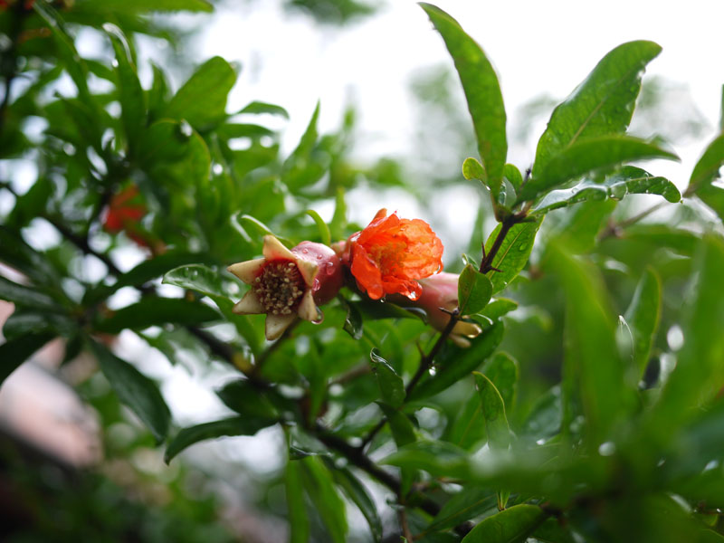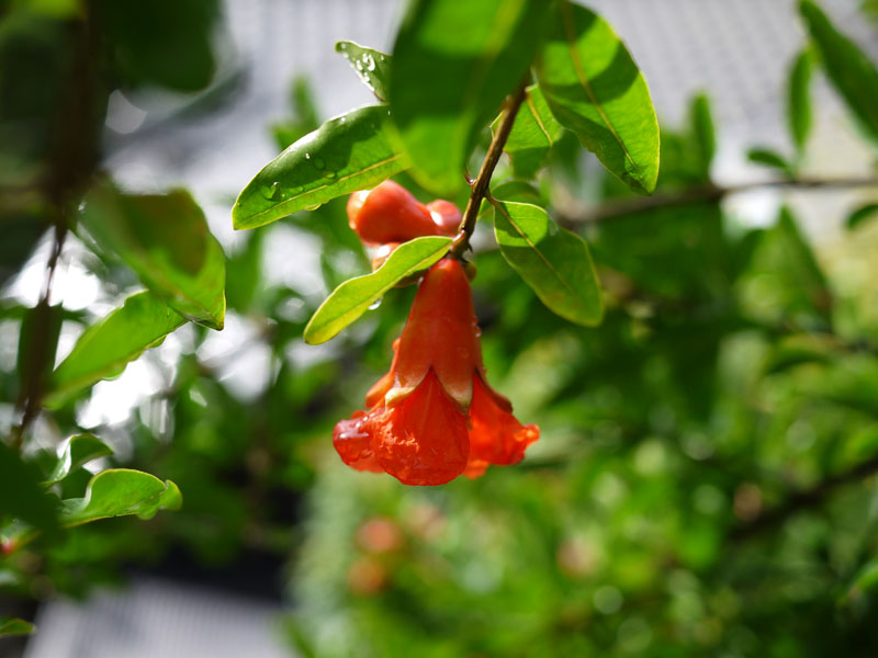 ザクロって言うと、実のイメージが強いですよね。でも花は意外と綺麗です。 しかも、こんな感じで花弁が開いてる時期って、短めなんですよ。すぐに散ってしまって、 こんなふうになってくる。最初の写真の花だって、 すぐにこんな風になってしまいます。それに、花によって開く時期がまちまちで、一斉に開いた様子も撮れなかったりします。しかも木の背が高いし、その割に花が小さいので、寄って撮りにくいし。なんとかうまく撮りたいなぁと、毎年思いながらいつの間にか時期が過ぎてしまいます。 実が熟す前に落ちてしまう花も多いんですよね。