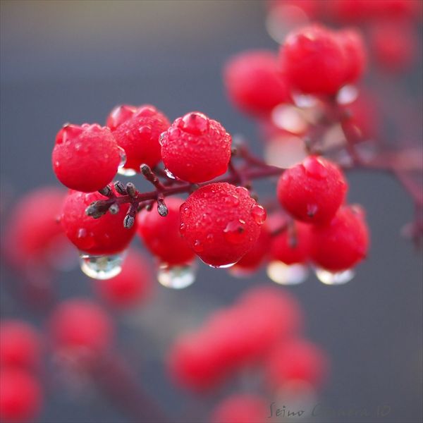 雨上がりの水滴が、朝日を反射して綺麗です。