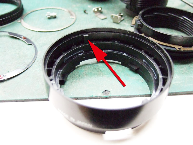 ではバラしにかかりますか。 まずはマウントを外します。矢印の三箇所のプラスネジを外しましょう。しかし何故か一箇所だけ黒いネジになってますね。 マウントが外れたら、矢印の3つの部品がポロポロと外せます。そしたら次は、ヘリコイドを分離するんですが、 無限遠にした時の位置を確認しときます。レンズ側の赤矢印の面と、鏡筒側の黄矢印の面がほぼツライチですね。組むときはこれを目安にします。では青矢印のプラスネジを外して、回り止め2箇所を取ります。 ということでヘリコイド分離。今回はレンズ側には手を加えません。鏡筒のピントリングの改造です。 では鏡筒のこちらから。矢印の三箇所のプラスネジを外すのですが、その前に、 こんなかんじで、マーキングしときましょうか。バラしてしまうとピントリングとヘリコイドの位置関係が変わりますので、同じ位置に組むための目安です。AFレンズですので、距離指標はあまり正確でなくてもいいかもしれませんが、やっぱりこのへんはきっちりしときたいところ。 ピントリングを外したら、矢印のネジ三箇所を外して、もういっちょ分離します。 そしたら鏡筒の内側の矢印の部分に注目。二箇所このような出っ張りがありますが、一箇所は無限遠側のストッパー。もう一箇所のこの矢印のところが、最短撮影距離側のストッパーです。ですのでこの出っ張りを、ニッパー等で躊躇なく切り落とします。 はい、こちら、切り落とし後。しかしこうなると、ストッパーがなくなってしまいますので、どこかにストッパーを設けないといけません。無くても一周すれば無限縁側で止まりはしますが、そこまで回せるほどヘリコイドに余裕がありません。それに加えて、問題はこちら。 この矢印の部分なのですが、これはマウント側の絞り連動ピンの動きをレンズ側の絞りに伝える部分です。で、ヘリコイドを繰り出しすぎると、このピンの長さの限界を超えて外れてしまうんですね。かと言ってこのピンを伸ばすと、ヘリコイドを縮めた時につっかえてしまって無限遠まで行かなくなるという、結構ギリギリの設計になってるんです。突き当たるところに穴掘れば伸ばせますが…ということで現状で届く範囲でとどめておきます。では、そのためのストッパーをどうするか。 ということでこの部品に活躍してもらいましょう。矢印の部分を折り曲げてみます。 はい、こんな感じに。3mmほど立ち上げればいいでしょうかね。そのへんはテーゲーで。ではこれを組み込んで、ちゃんと動くかどうか確認します。 が、ヘリコイドを回すと、ほんの少し干渉してしまいますね。なので、曲げた部分を当たらなくなるまで少し削りましょう。これでオッケー。ではレンズを組み直して、AFの動作と絞りの動作、オートで適正露出になるかも確認しましょうか。うん、ちゃんと動作してますよ。ただちょっと、 最短撮影距離まで回すと、黄矢印のように隙が出ますね。ま、いっか。ついでになんとなく指標のために、最短撮影距離のところにマーキングしておきましょう。このレンズの元々の最短撮影距離は45cm。そこからある程度は余分に回るようになりました。果たして最短撮影距離はどのくらいになったのでしょうか。 う、開放で撮ると被写界深度浅いですね。拡大してみましょう。 えーっと、概ね38cmですか。7cmほど余分に寄れるようになりましたね。できれば30cm以内にしたかったところですが、そこまでは対応できそうにありませんので、これで良しとしときましょう。微妙な結果になってしまいましたが、AF-NIKKOR 50mm F1.8の最短撮影距離を縮めることに一応成功ということで。